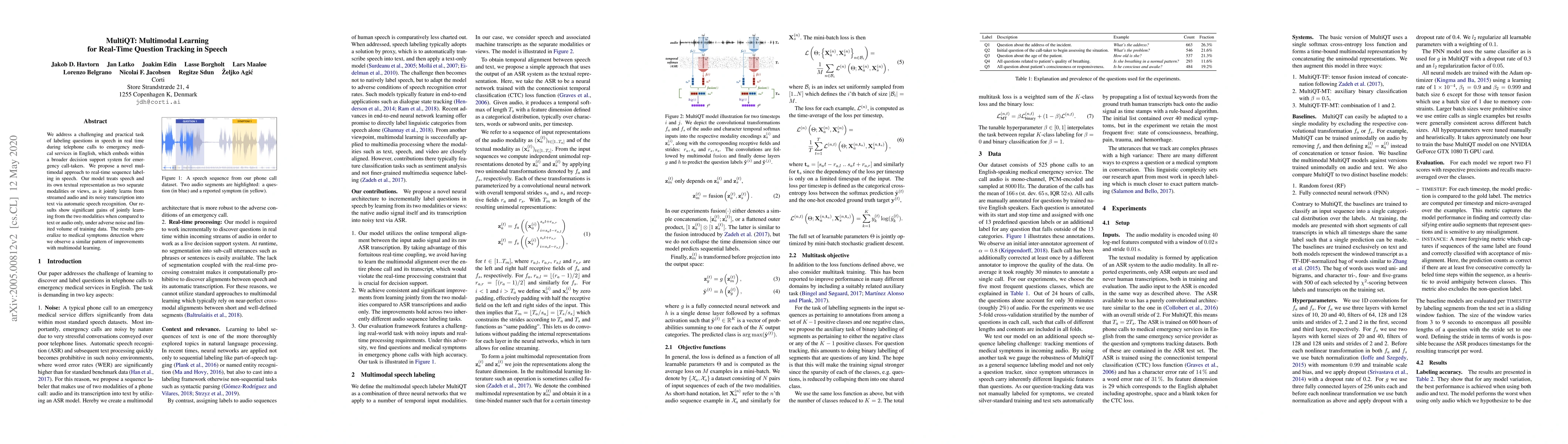 This paper proposes a multimodal learning approach called MultiQT for real-time question tracking in speech during emergency calls. The model leverages both audio and noisy transcriptions to achieve better performance than using either modality alone, showing significant improvements in adverse conditions.
