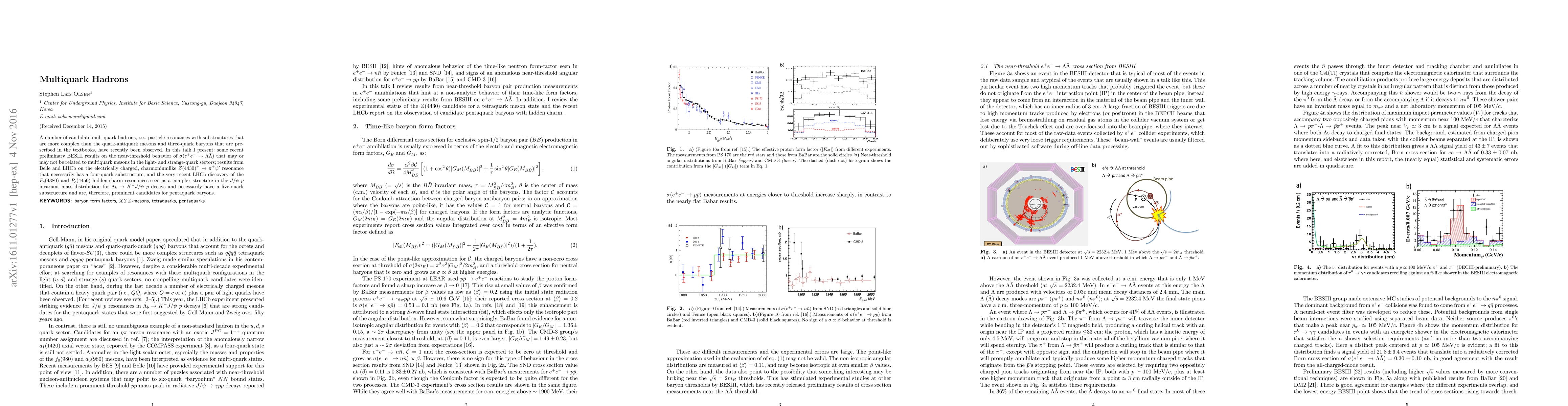 A number of candidate multiquark hadrons, i.e., particle resonances with substructures that are more complex than the quark-antiquark mesons and three-quark baryons that are prescribed in the textbooks, have recently been observed. In this talk I present: some recent preliminary BESIII results on the near-threshold behavior of sigma(e+e- --> Lambda Lambda-bar) that may or may not be related to multiquark mesons in the light- and strange-quark sectors; results from Belle and LHCb on the electrically charged, charmoniumlike Z(4430)^+ --> pi^+ psi ' resonance that necessarily has a four-quark substructure; and the recent LHCb discovery of the P_c(4380) and P_c(4450) hidden-charm resonances seen as a complex structure in the J/psi p invariant mass distribution for Lambda_b --> K^-J/psi p decays and necessarily have a five-quark substructure and are, therefore, prominent candidates for pentaquark baryons.