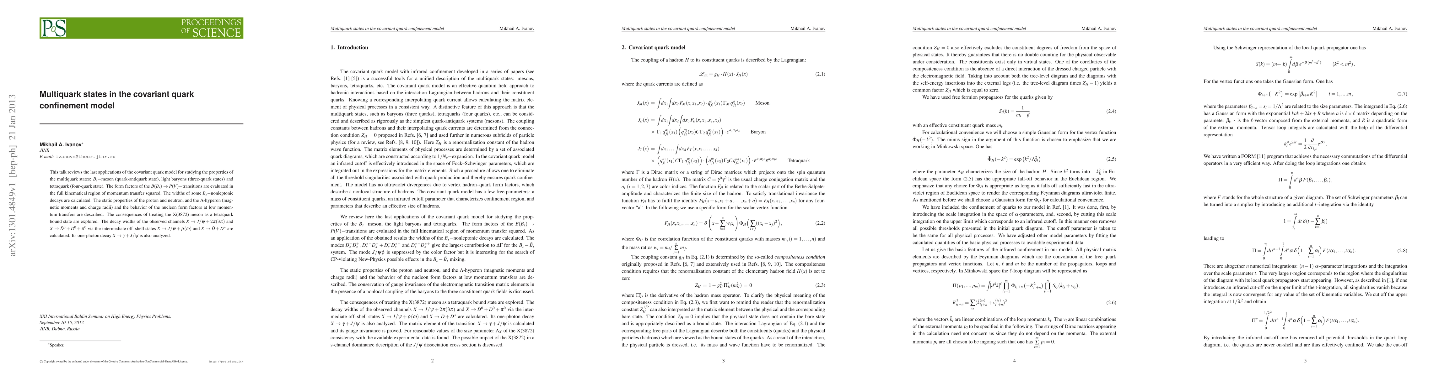 This paper investigates multiquark states in the covariant quark confinement model, calculating form factors, decay widths, and static properties of particles like the proton and hyperon.