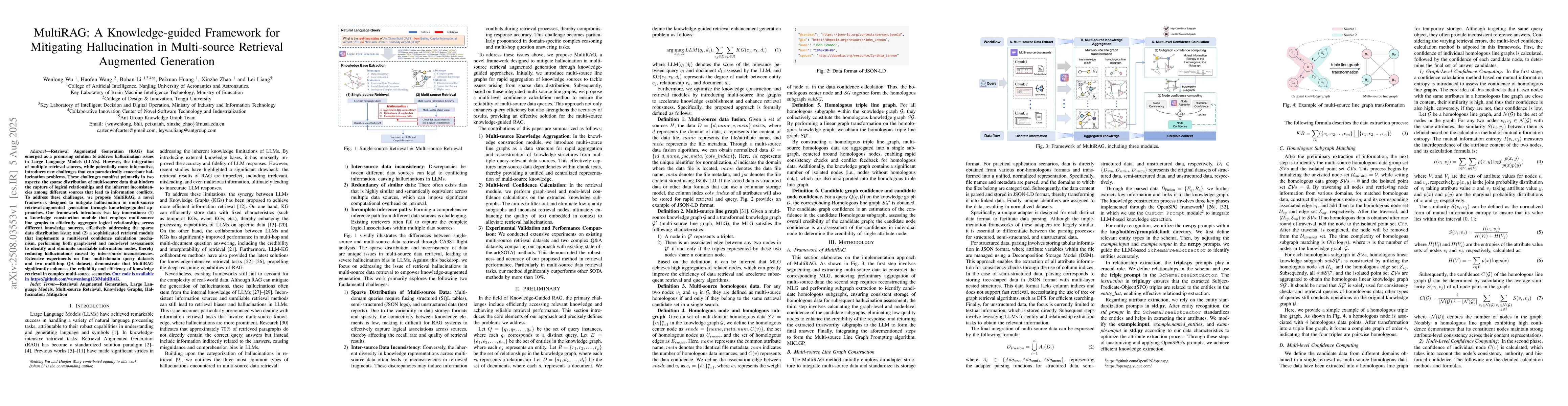 Retrieval Augmented Generation (RAG) has emerged as a promising solution to address hallucination issues in Large Language Models (LLMs). However, the integration of multiple retrieval sources, while potentially more informative, introduces new challenges that can paradoxically exacerbate hallucination problems. These challenges manifest primarily in two aspects: the sparse distribution of multi-source data that hinders the capture of logical relationships and the inherent inconsistencies among different sources that lead to information conflicts. To address these challenges, we propose MultiRAG, a novel framework designed to mitigate hallucination in multi-source retrieval-augmented generation through knowledge-guided approaches. Our framework introduces two key innovations: (1) a knowledge construction module that employs multi-source line graphs to efficiently aggregate logical relationships across different knowledge sources, effectively addressing the sparse data distribution issue; and (2) a sophisticated retrieval module that implements a multi-level confidence calculation mechanism, performing both graph-level and node-level assessments to identify and eliminate unreliable information nodes, thereby reducing hallucinations caused by inter-source inconsistencies. Extensive experiments on four multi-domain query datasets and two multi-hop QA datasets demonstrate that MultiRAG significantly enhances the reliability and efficiency of knowledge retrieval in complex multi-source scenarios. \textcolor{blue}{Our code is available in https://github.com/wuwenlong123/MultiRAG.