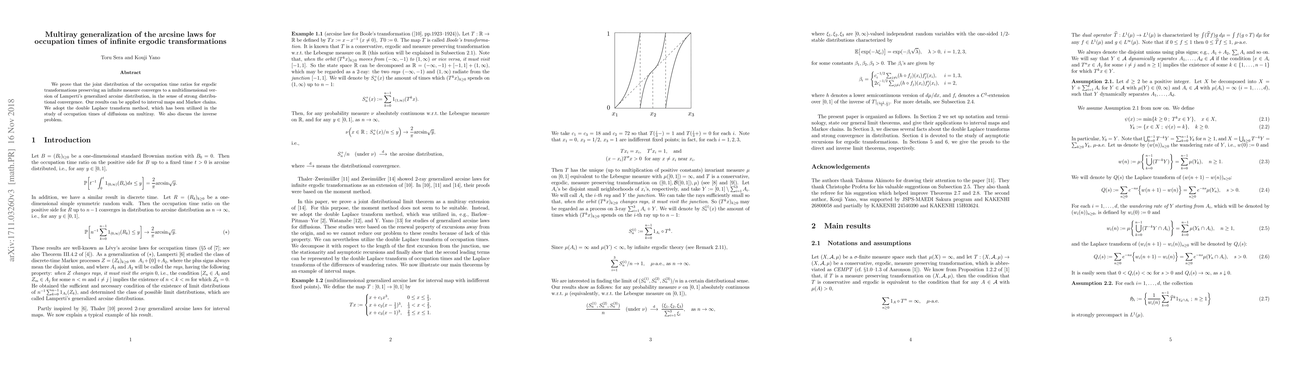 This paper proves the convergence of the joint distribution of occupation time ratios for infinite ergodic transformations to a multidimensional version of Lamperti's arcsine distribution, using the double Laplace transform method. The results apply to interval maps and Markov chains, and the study also addresses the inverse problem.