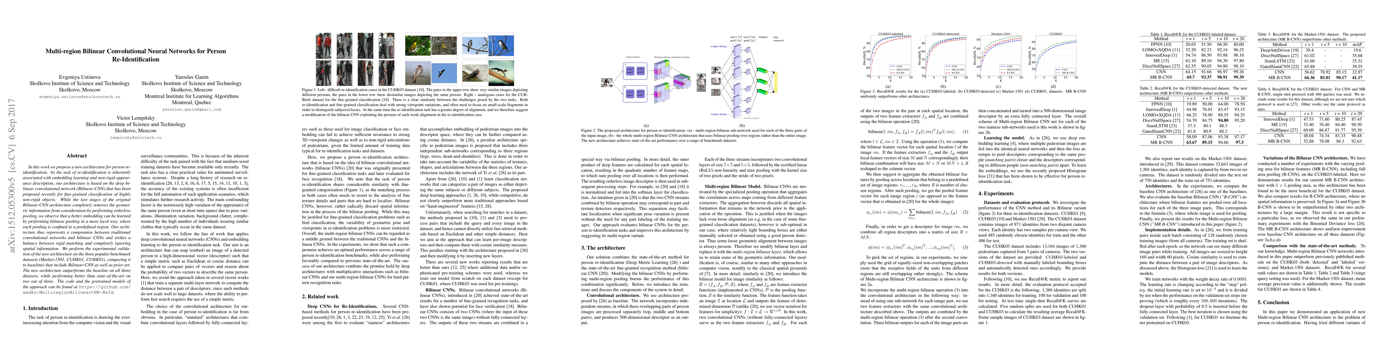 This paper proposes a multiregion bilinear convolutional neural network (Bilinear-CNN) architecture for person re-identification, which uses local bilinear pooling to better capture spatial information compared to traditional methods. Experimental results on three benchmark datasets show superior performance over baselines and state-of-the-art methods on two datasets.