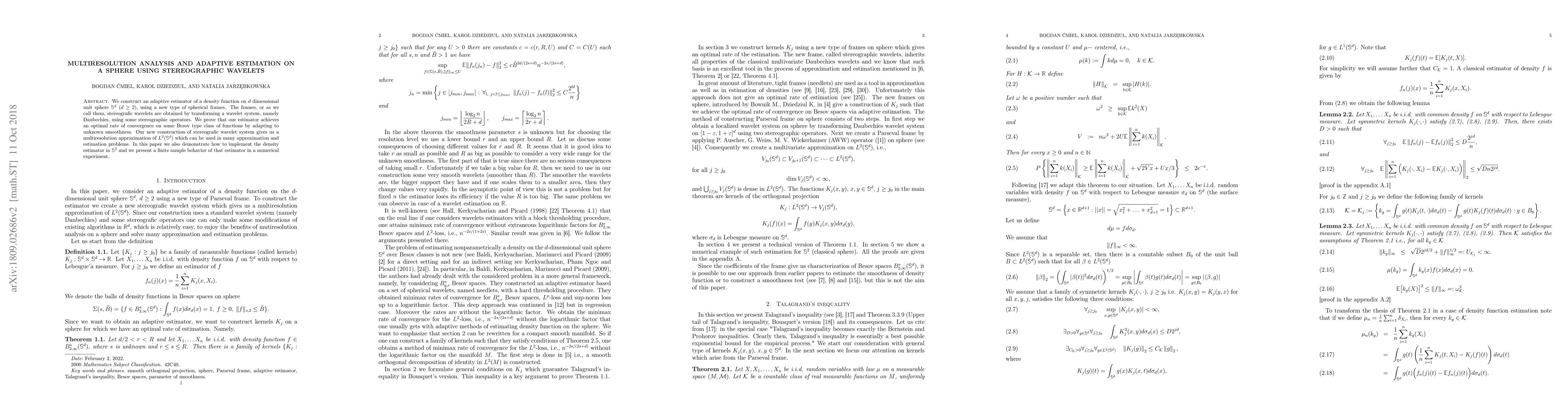 We construct an adaptive estimator of a density function on $d$ dimensional unit sphere $S^d$ ($d \geq 2 $), using a new type of spherical frames. The frames, or as we call them, stereografic wavelets are obtained by transforming a wavelet system, namely Daubechies, using some stereographic operators. We prove that our estimator achieves an optimal rate of convergence on some Besov type class of functions by adapting to unknown smoothness. Our new construction of stereografic wavelet system gives us a multiresolution approximation of $L^2(S^d)$ which can be used in many approximation and estimation problems. In this paper we also demonstrate how to implement the density estimator in $S^2$ and we present a finite sample behavior of that estimator in a numerical experiment.