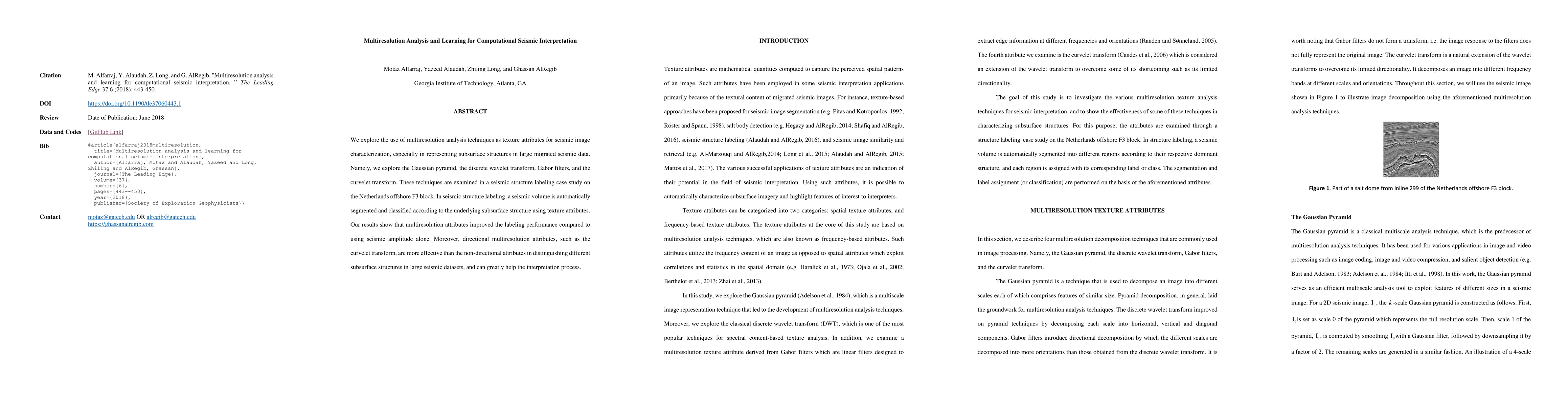 The paper presents a comprehensive analysis of various multiresolution texture attributes for seismic image characterization, demonstrating the superiority of directional features like the curvelet transform in distinguishing subsurface structures.