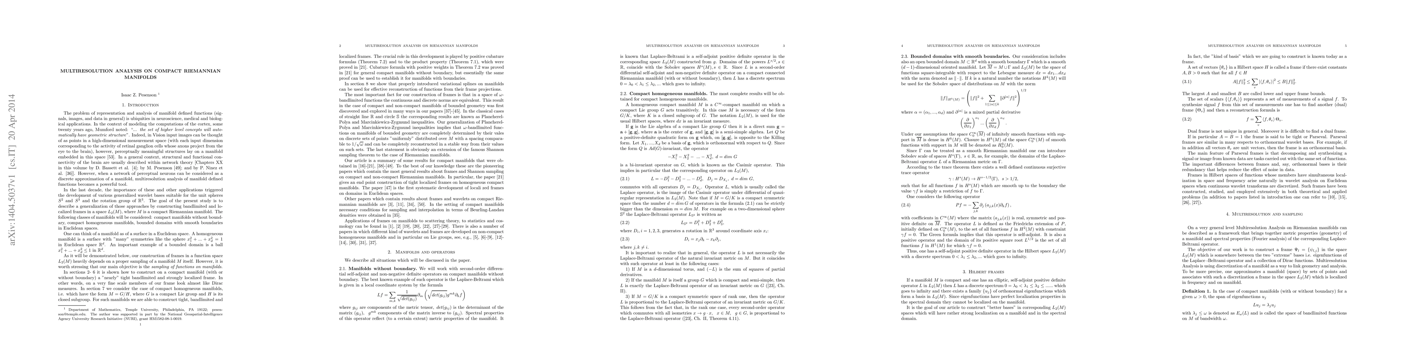 In the chapter "Multiresolution Analysis on Compact Riemannian Manifolds" Isaac Pesenson describes multiscale analysis, sampling, interpolation and approximation of functions defined on manifolds. His main achievements are: construction on manifolds of bandlimited and space-localized frames which have Parseval property and construction of variational splines on manifolds. Such frames and splines enable multiscale analysis on arbitrary compact manifolds, and they already found a number of important applications (statistics, CMB, crystallography) related to such manifolds as two-dimensional sphere and group of its rotations.