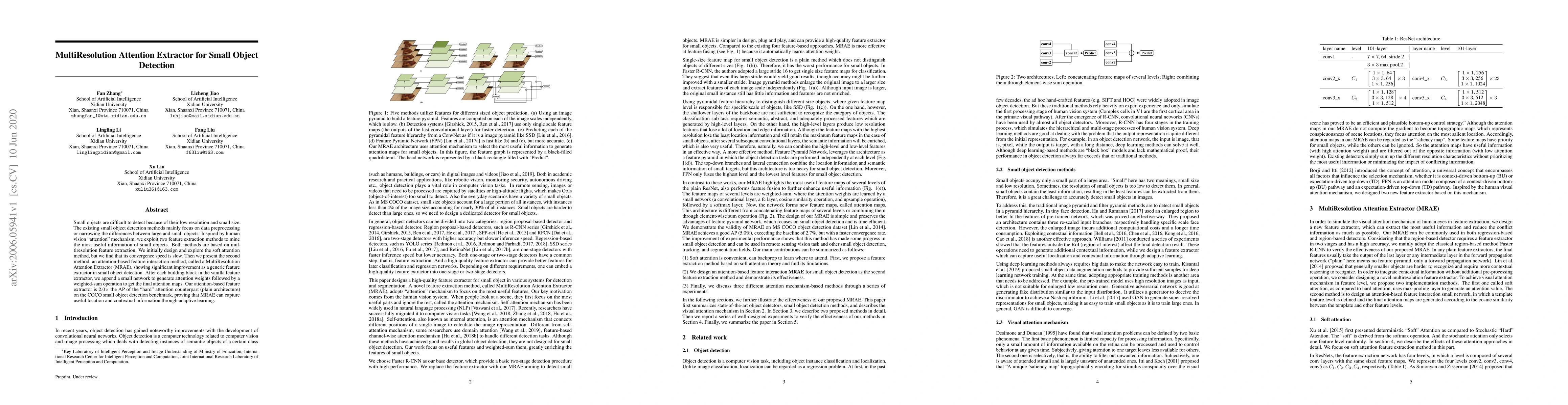 Small objects are difficult to detect because of their low resolution and small size. The existing small object detection methods mainly focus on data preprocessing or narrowing the differences between large and small objects. Inspired by human vision "attention" mechanism, we exploit two feature extraction methods to mine the most useful information of small objects. Both methods are based on multiresolution feature extraction. We initially design and explore the soft attention method, but we find that its convergence speed is slow. Then we present the second method, an attention-based feature interaction method, called a MultiResolution Attention Extractor (MRAE), showing significant improvement as a generic feature extractor in small object detection. After each building block in the vanilla feature extractor, we append a small network to generate attention weights followed by a weighted-sum operation to get the final attention maps. Our attention-based feature extractor is 2.0 times the AP of the "hard" attention counterpart (plain architecture) on the COCO small object detection benchmark, proving that MRAE can capture useful location and contextual information through adaptive learning.