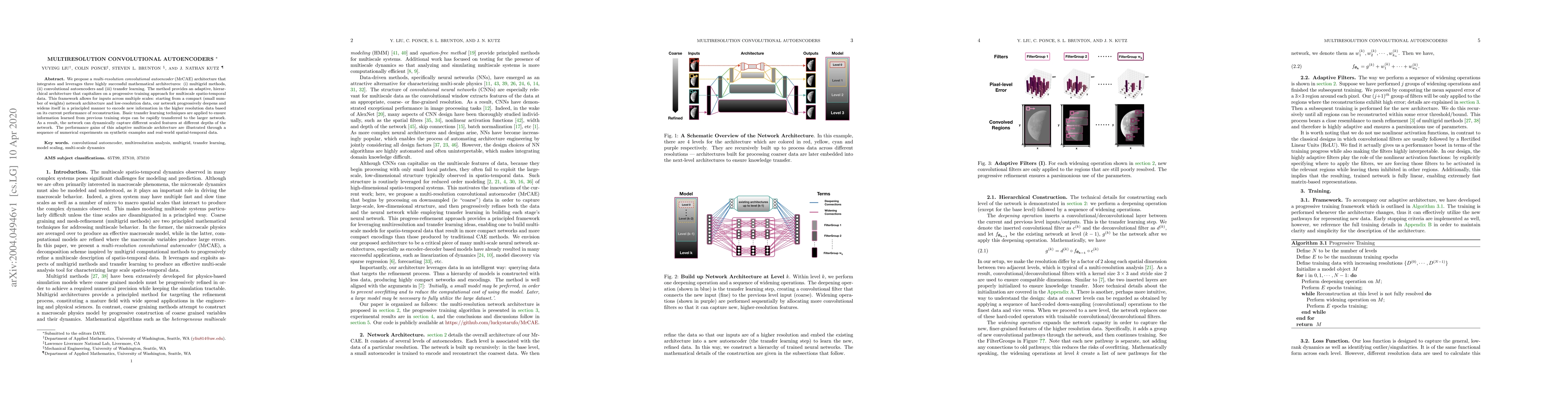 The paper proposes a multi-resolution convolutional autoencoder (MrCAE) that combines multigrid methods, convolutional autoencoders, and transfer learning for adaptive, hierarchical processing of multiscale spatio-temporal data. The network dynamically adjusts its architecture and resolution based on performance, achieving better feature capture across scales.