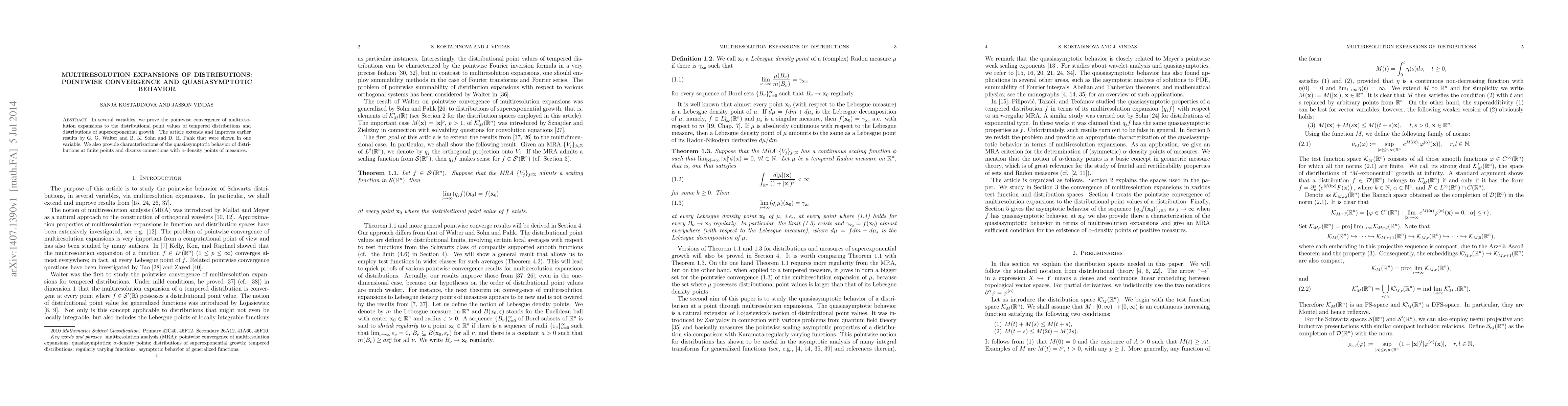 This paper proves the pointwise convergence of multiresolution expansions to the values of tempered distributions and distributions of superexponential growth in several variables, extending prior one-variable results. It also characterizes the quasiasymptotic behavior of distributions and explores connections with $\alpha$-density points of measures.