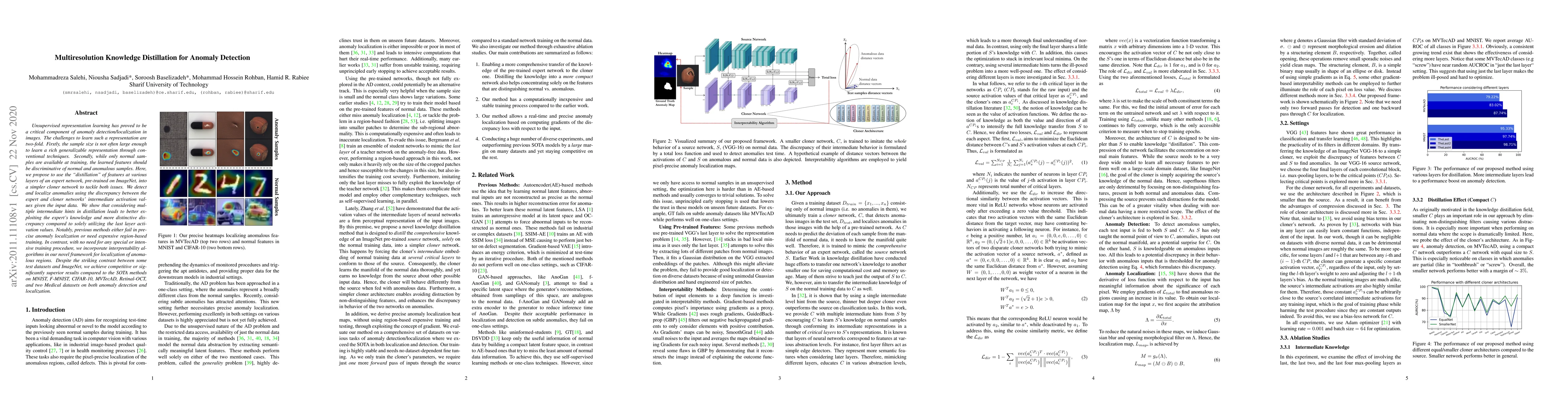 Unsupervised representation learning has proved to be a critical component of anomaly detection/localization in images. The challenges to learn such a representation are two-fold. Firstly, the sample size is not often large enough to learn a rich generalizable representation through conventional techniques. Secondly, while only normal samples are available at training, the learned features should be discriminative of normal and anomalous samples. Here, we propose to use the "distillation" of features at various layers of an expert network, pre-trained on ImageNet, into a simpler cloner network to tackle both issues. We detect and localize anomalies using the discrepancy between the expert and cloner networks' intermediate activation values given the input data. We show that considering multiple intermediate hints in distillation leads to better exploiting the expert's knowledge and more distinctive discrepancy compared to solely utilizing the last layer activation values. Notably, previous methods either fail in precise anomaly localization or need expensive region-based training. In contrast, with no need for any special or intensive training procedure, we incorporate interpretability algorithms in our novel framework for the localization of anomalous regions. Despite the striking contrast between some test datasets and ImageNet, we achieve competitive or significantly superior results compared to the SOTA methods on MNIST, F-MNIST, CIFAR-10, MVTecAD, Retinal-OCT, and two Medical datasets on both anomaly detection and localization.