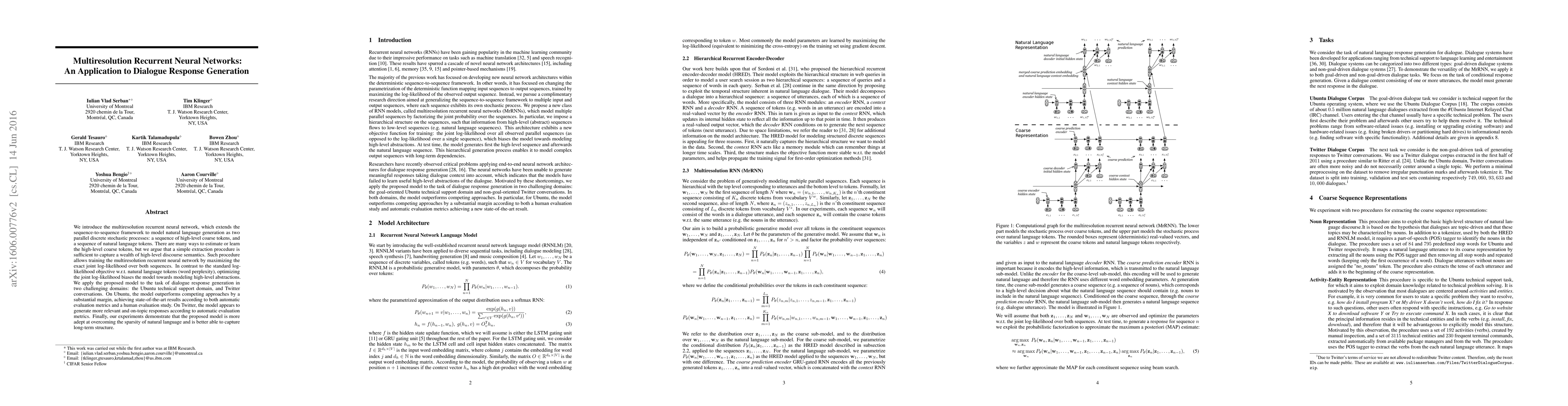 We introduce the multiresolution recurrent neural network, which extends the sequence-to-sequence framework to model natural language generation as two parallel discrete stochastic processes: a sequence of high-level coarse tokens, and a sequence of natural language tokens. There are many ways to estimate or learn the high-level coarse tokens, but we argue that a simple extraction procedure is sufficient to capture a wealth of high-level discourse semantics. Such procedure allows training the multiresolution recurrent neural network by maximizing the exact joint log-likelihood over both sequences. In contrast to the standard log- likelihood objective w.r.t. natural language tokens (word perplexity), optimizing the joint log-likelihood biases the model towards modeling high-level abstractions. We apply the proposed model to the task of dialogue response generation in two challenging domains: the Ubuntu technical support domain, and Twitter conversations. On Ubuntu, the model outperforms competing approaches by a substantial margin, achieving state-of-the-art results according to both automatic evaluation metrics and a human evaluation study. On Twitter, the model appears to generate more relevant and on-topic responses according to automatic evaluation metrics. Finally, our experiments demonstrate that the proposed model is more adept at overcoming the sparsity of natural language and is better able to capture long-term structure.