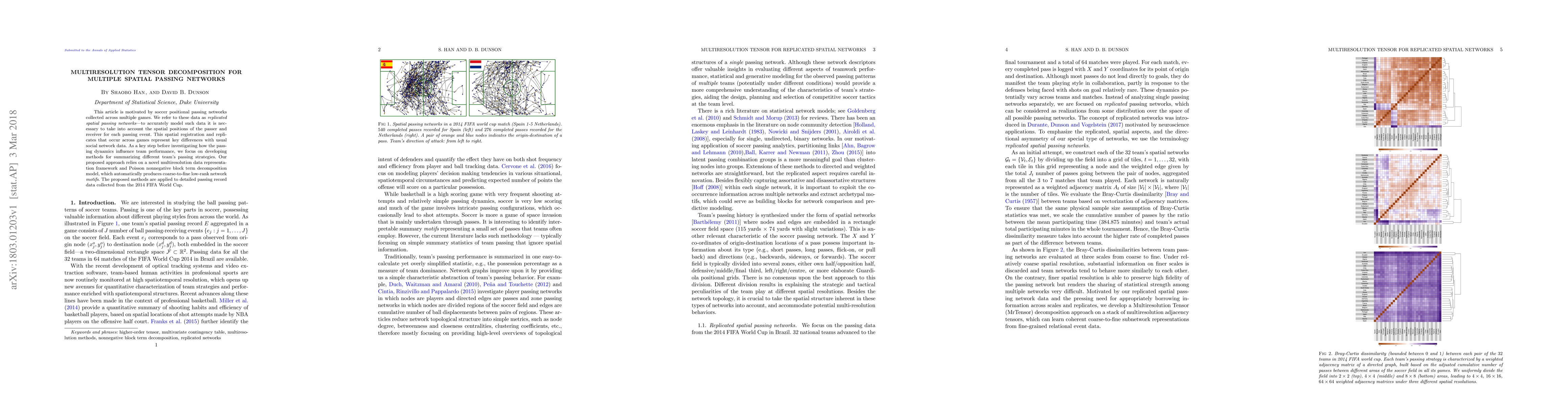 This paper proposes a multiresolution tensor decomposition method to model replicated spatial passing networks in soccer, focusing on summarizing different teams' passing strategies. The approach uses a Poisson nonnegative block term decomposition model to generate low-rank network motifs, applied to passing data from the 2014 FIFA World Cup.