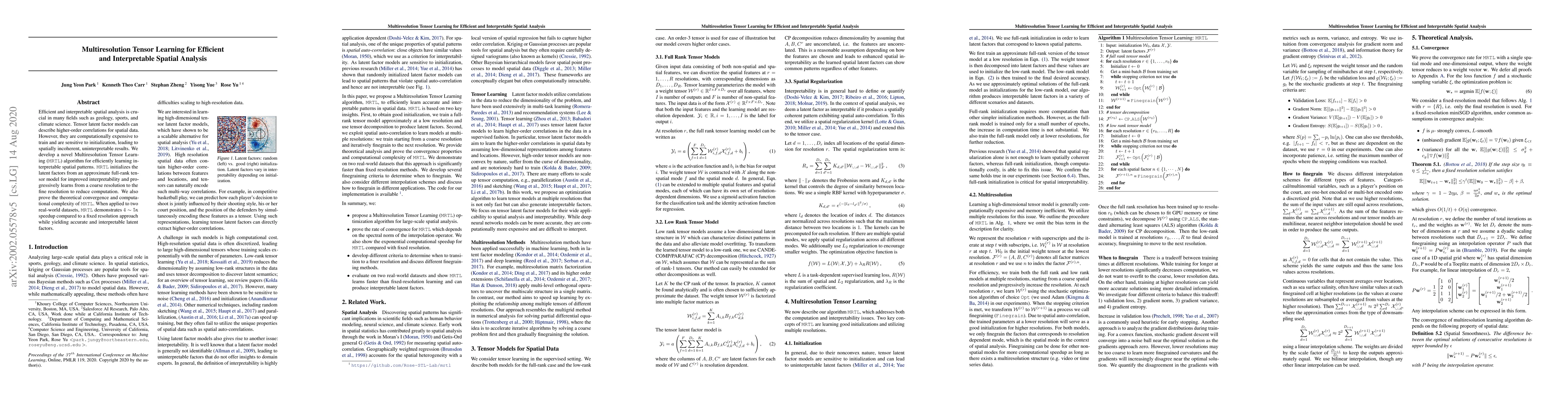 The paper introduces a Multiresolution Tensor Learning (MRTL) algorithm to efficiently and interpretably analyze spatial data, achieving a 4~5x speedup compared to fixed resolution methods while maintaining accuracy and interpretability. MRTL leverages a coarse-to-fine resolution approach and initializes latent factors from an approximate full-rank tensor model for better interpretability.