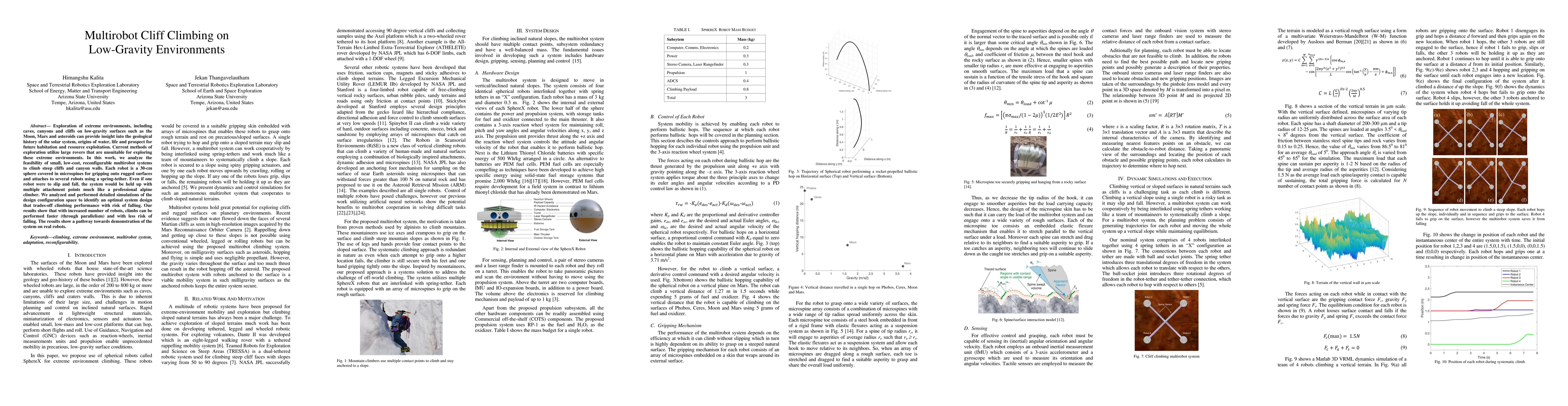 Exploration of extreme environments, including caves, canyons and cliffs on low-gravity surfaces such as the Moon, Mars and asteroids can provide insight into the geological history of the solar system, origins of water, life and prospect for future habitation and resource exploitation. Current methods of exploration utilize large rovers that are unsuitable for exploring these extreme environments. In this work, we analyze the feasibility of small, low-cost, reconfigurable multirobot systems to climb steep cliffs and canyon walls. Each robot is a 30-cm sphere covered in microspines for gripping onto rugged surfaces and attaches to several robots using a spring-tether. Even if one robot were to slip and fall, the system would be held up with multiple attachment points much like a professional alpine climber. We analyzed and performed detailed simulations of the design configuration space to identify an optimal system design that trades off climbing performance with risk of falling. Our results identify a system of 4 robots is best suited when enabling single-robot climbs, while a system of 6 robots are suited when two robots climb simultaneously. The results show a pathway towards demonstration of the system on real robots.