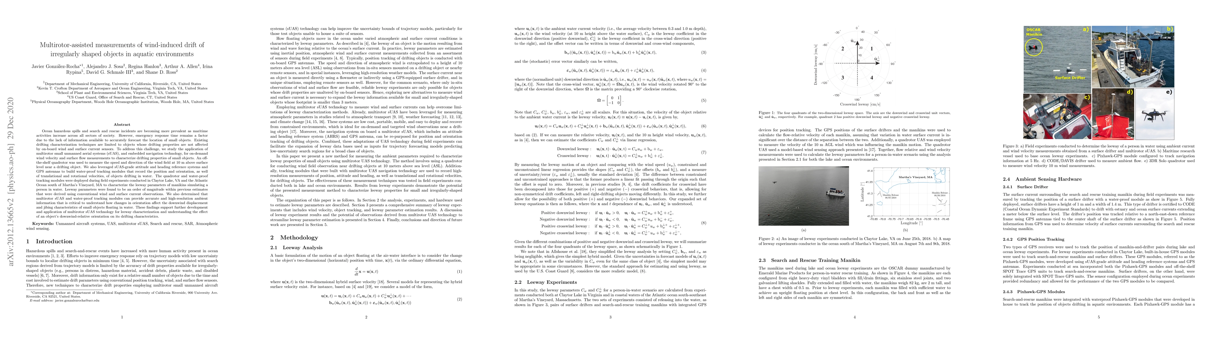 Ocean hazardous spills and search and rescue incidents are more prevalent as maritime activities increase across all sectors of society. However, emergency response time remains a factor due to a lack of information to accurately forecast the location of small objects. Existing drifting characterization techniques are limited to objects whose drifting properties are not affected by on-board wind and surface current sensors. To address this challenge, we study the application of multirotor unmanned aerial systems (UAS), and embedded navigation technology, for on-demand wind velocity and surface flow measurements to characterize drifting properties of small objects. An off-the-shelf quadrotor was used to measure wind velocity at 10 m above surface level near a drifting object. We also leveraged UAS-grade attitude and heading reference systems and GPS antennas to build water-proof tracking modules that record the position and orientation, as well of translational and rotational velocities, of objects drifting in water. The quadrotor and water-proof tracking modules were deployed during field experiments conducted in lake and ocean environments to characterize the leeway parameters of manikins simulating a person in water. Leeway parameters were found to be an order of magnitude within previous estimates derived using conventional wind and surface current observations. We also determined that multirotor UAS and water-proof tracking modules can provide accurate and high-resolution ambient information that is critical to understand how changes in orientation affect the downwind displacement and jibing characteristics of small objects floating in water. These findings support further development and application of multirotor UAS technology for leeway characterization and understanding the effect of an object's downwind-relative orientation on its drifting characteristics.