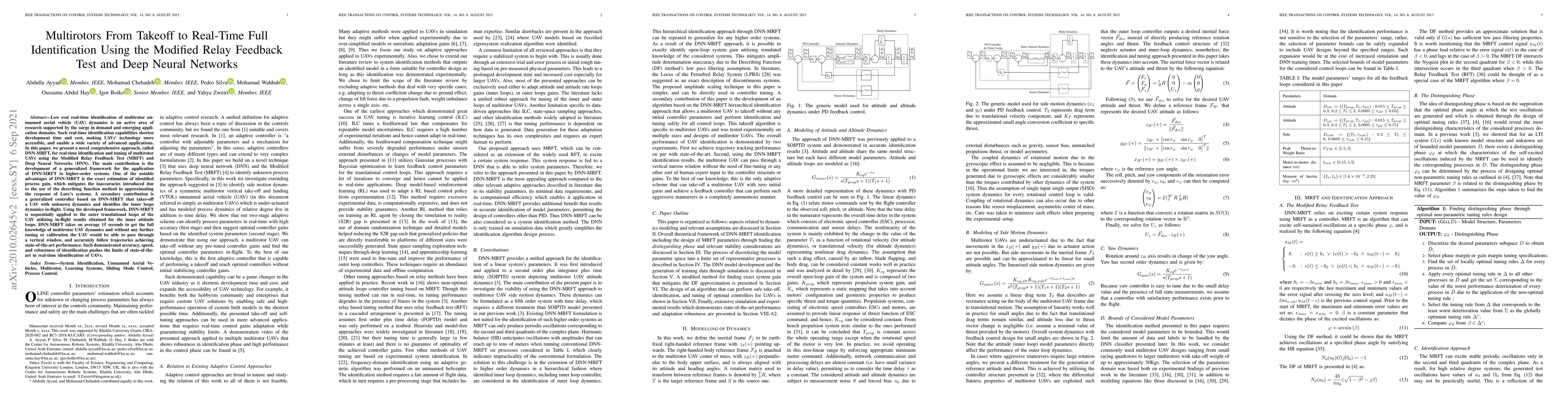 Low cost real-time identification of multirotor unmanned aerial vehicle (UAV) dynamics is an active area of research supported by the surge in demand and emerging application domains. Such real-time identification capabilities shorten development time and cost, making UAVs' technology more accessible, and enable a wide variety of advanced applications. In this paper, we present a novel comprehensive approach, called DNN-MRFT, for real-time identification and tuning of multirotor UAVs using the Modified Relay Feedback Test (MRFT) and Deep Neural Networks (DNN). The main contribution is the development of a generalized framework for the application of DNN-MRFT to higher-order systems. One of the notable advantages of DNN-MRFT is the exact estimation of identified process gain, which mitigates the inaccuracies introduced due to the use of the describing function method in approximating the response of Lure's systems. A secondary contribution is a generalized controller based on DNN-MRFT that takes-off a UAV with unknown dynamics and identifies the inner loops dynamics in-flight. Using the developed framework, DNN-MRFT is sequentially applied to the outer translational loops of the UAV utilizing in-flight results obtained for the inner attitude loops. DNN-MRFT takes on average 15 seconds to get the full knowledge of multirotor UAV dynamics and without any further tuning or calibration the UAV would be able to pass through a vertical window, and accurately follow trajectories achieving state-of-the-art performance. Such demonstrated accuracy, speed, and robustness of identification pushes the limits of state-of-the-art in real-time identification of UAVs.