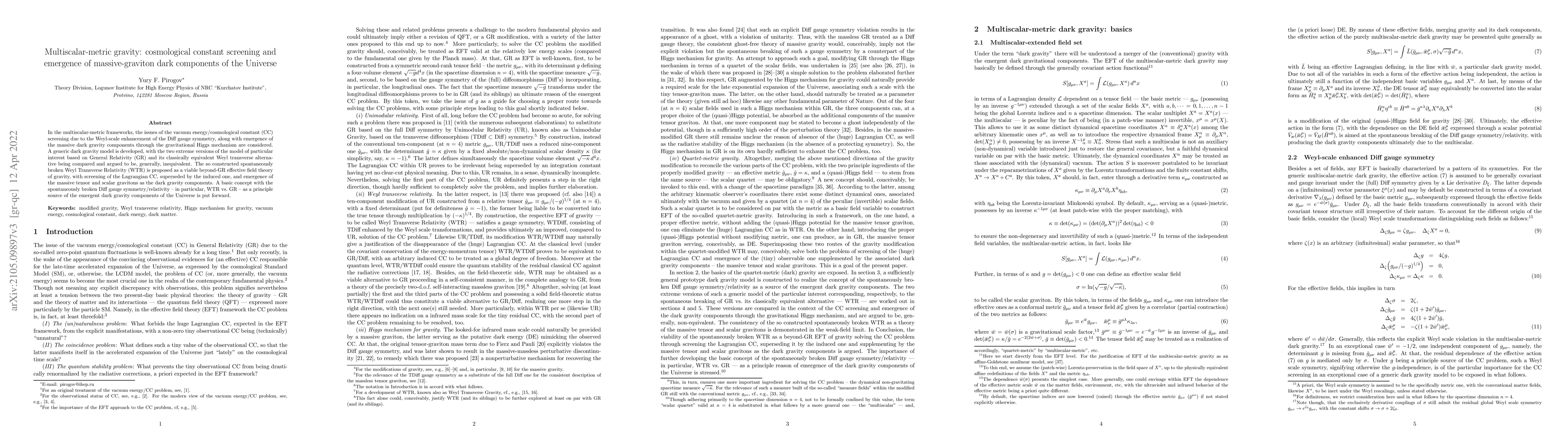 In the multiscalar-metric frameworks, the issues of the vacuum energy/cosmological constant (CC) screening due to the Weyl-scale enhancement of the Diff gauge symmetry, along with emergence of the massive dark gravity components through the gravitational Higgs mechanism are considered. A generic dark gravity model is developed, with the two extreme versions of the model of particular interest based on General Relativity (GR) and its classically equivalent Weyl transverse alternative being compared and argued to be, generally, inequivalent. The so constructed spontaneously broken Weyl Transverse Relativity (WTR) is proposed as a viable beyond-GR effective field theory of gravity, with screening of the Lagrangian CC, superseded by the induced one, and emergence of the massive tensor and scalar gravitons as the dark gravity components. A basic concept with the spontaneously broken Diff gauge symmetry/relativity -- in particular, WTR vs. GR -- as a principle source of the emergent dark gravity components of the Universe is put forward.