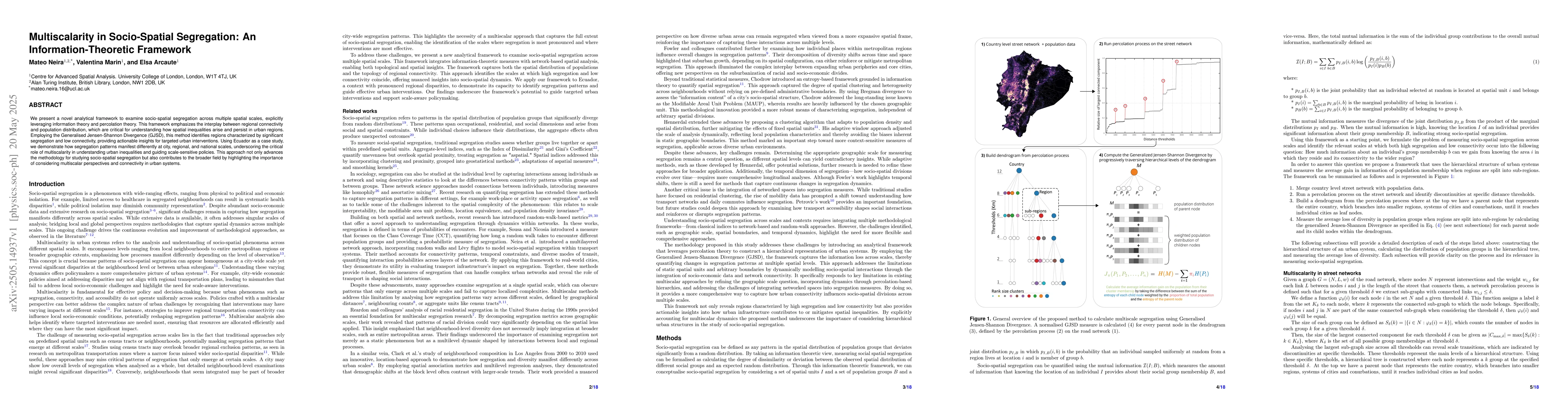 The research employs an information-theoretic framework using Generalised Jensen-Shannon Divergence (GJSD) to analyze socio-spatial segregation across multiple spatial scales, integrating percolation theory and focusing on regional connectivity and population distribution.