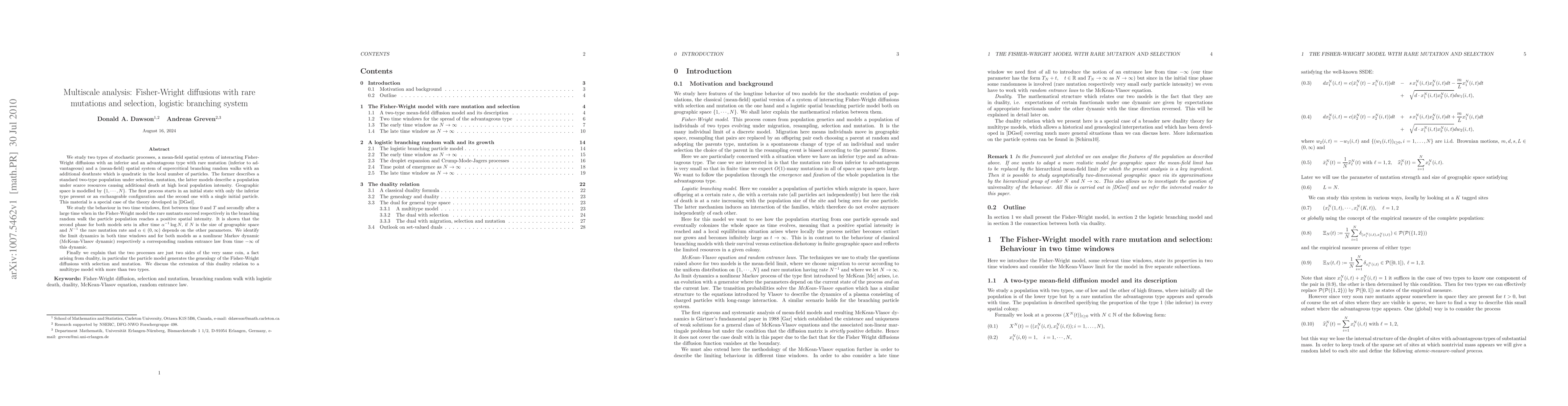 We study two types of stochastic processes, a mean-field spatial system of interacting Fisher-Wright diffusions with an inferior and an advantageous type with rare mutation (inferior to advantageous) and a (mean-field) spatial system of supercritical branching random walks with an additional deathrate which is quadratic in the local number of particles. The former describes a standard two-type population under selection, mutation, the latter models describe a population under scarce resources causing additional death at high local population intensity. Geographic space is modelled by $\{1, \cdots, N\}$. The first process starts in an initial state with only the inferior type present or an exchangeable configuration and the second one with a single initial particle. {This material is a special case of the theory developed in \cite{DGsel}.} We study the behaviour in two time windows, first between time 0 and $T$ and secondly after a large time when in the Fisher-Wright model the rare mutants succeed respectively in the branching random walk the particle population reaches a positive spatial intensity. It is shown that the second phase for both models sets in after time $\alpha^{-1} \log N$, if $N$ is the size of geographic space and $N^{-1}$ the rare mutation rate and $\alpha \in (0, \infty)$ depends on the other parameters. We identify the limit dynamics in both time windows and for both models as a nonlinear Markov dynamic (McKean-Vlasov dynamic) respectively a corresponding random entrance law from time $-\infty$ of this dynamic. Finally we explain that the two processes are just two sides of the very same coin, a fact arising from duality, in particular the particle model generates the genealogy of the Fisher-Wright diffusions with selection and mutation. We discuss the extension of this duality relation to a multitype model with more than two types.