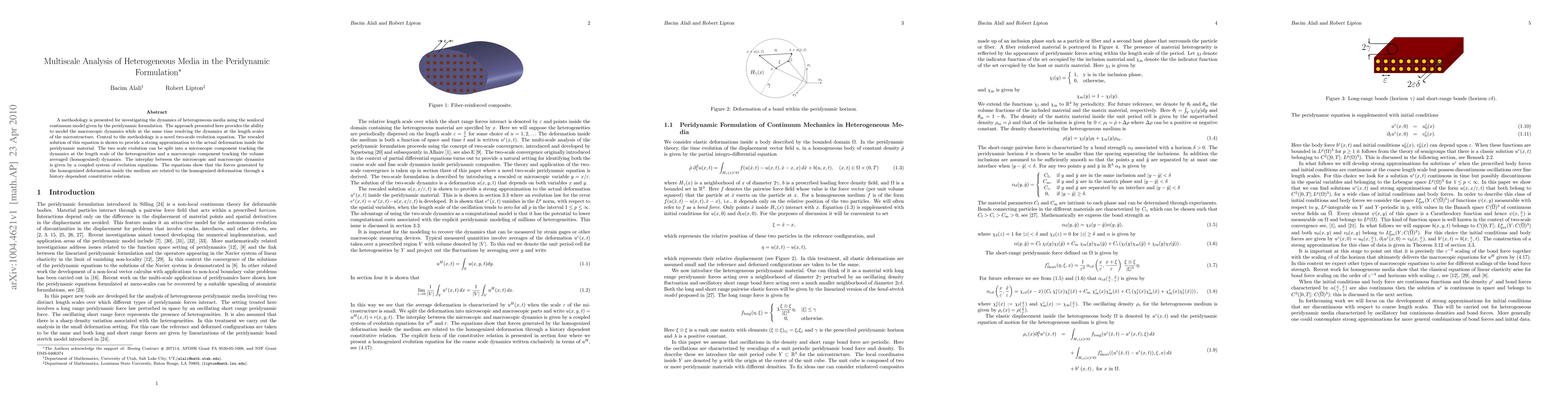 This paper introduces a multiscale methodology for analyzing the dynamics of heterogeneous media using the peridynamic formulation, which allows for modeling both macroscopic and microscopic deformations. The approach employs a novel two-scale evolution equation to capture the interplay between microscopic heterogeneities and macroscopic dynamics, providing a strong approximation to the material's deformation behavior.