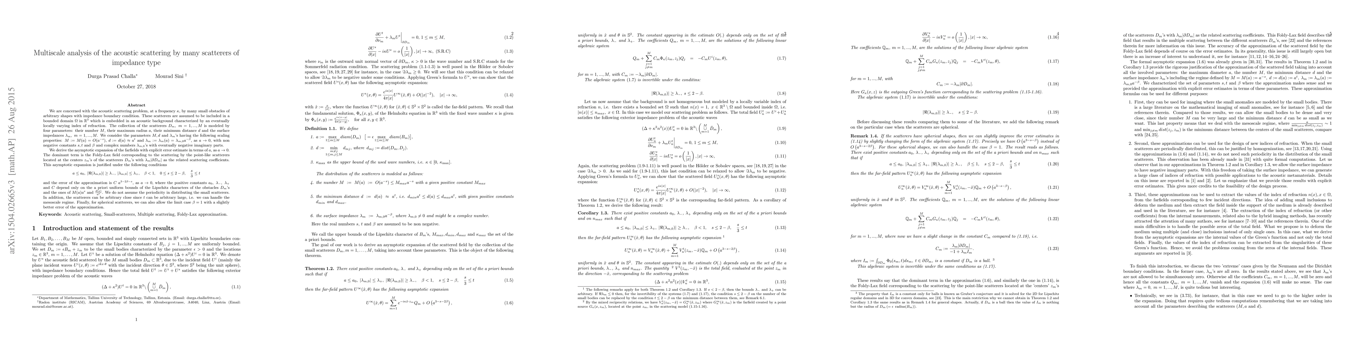 We are concerned with the acoustic scattering problem, at a frequency $\kappa$, by many small obstacles of arbitrary shapes with impedance boundary condition. These scatterers are assumed to be included in a bounded domain $\Omega$ in $\mathbb{R}^3$ which is embedded in an acoustic background characterized by an eventually locally varying index of refraction. The collection of the scatterers $D_m, \; m=1,...,M$ is modeled by four parameters: their number $M$, their maximum radius $a$, their minimum distance $d$ and the surface impedances $\lambda_m, \; m=1,...,M$. We consider the parameters $M, d$ and $\lambda_m$'s having the following scaling properties: $M:=M(a)=O(a^{-s})$, $d:=d(a)\approx a^t$ and $\lambda_m:=\lambda_m(a)=\lambda_{m,0}a^{-\beta}$, as $a \rightarrow 0$, with non negative constants $s, t$ and $\beta$ and complex numbers $\lambda_{m, 0}$'s with eventually negative imaginary parts. We derive the asymptotic expansion of the farfields with explicit error estimate in terms of $a$, as $a\rightarrow 0$. The dominant term is the Foldy-Lax field corresponding to the scattering by the point-like scatterers located at the centers $z_m$'s of the scatterers $D_m$'s with $\lambda_m \vert \partial D_m\vert$ as the related scattering coefficients.
