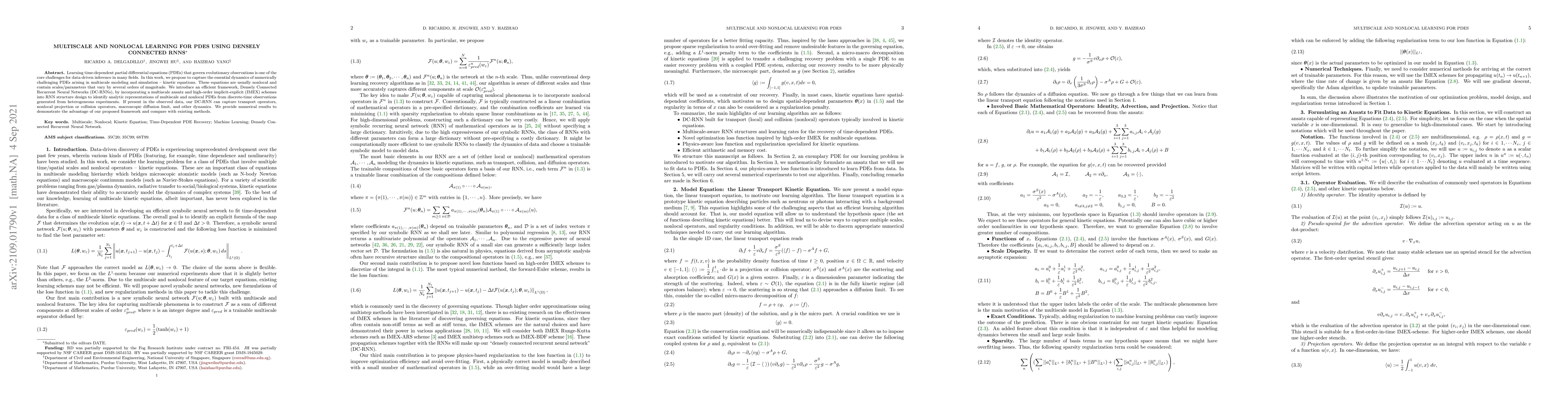 Learning time-dependent partial differential equations (PDEs) that govern evolutionary observations is one of the core challenges for data-driven inference in many fields. In this work, we propose to capture the essential dynamics of numerically challenging PDEs arising in multiscale modeling and simulation -- kinetic equations. These equations are usually nonlocal and contain scales/parameters that vary by several orders of magnitude. We introduce an efficient framework, Densely Connected Recurrent Neural Networks (DC-RNNs), by incorporating a multiscale ansatz and high-order implicit-explicit (IMEX) schemes into RNN structure design to identify analytic representations of multiscale and nonlocal PDEs from discrete-time observations generated from heterogeneous experiments. If present in the observed data, our DC-RNN can capture transport operators, nonlocal projection or collision operators, macroscopic diffusion limit, and other dynamics. We provide numerical results to demonstrate the advantage of our proposed framework and compare it with existing methods.
