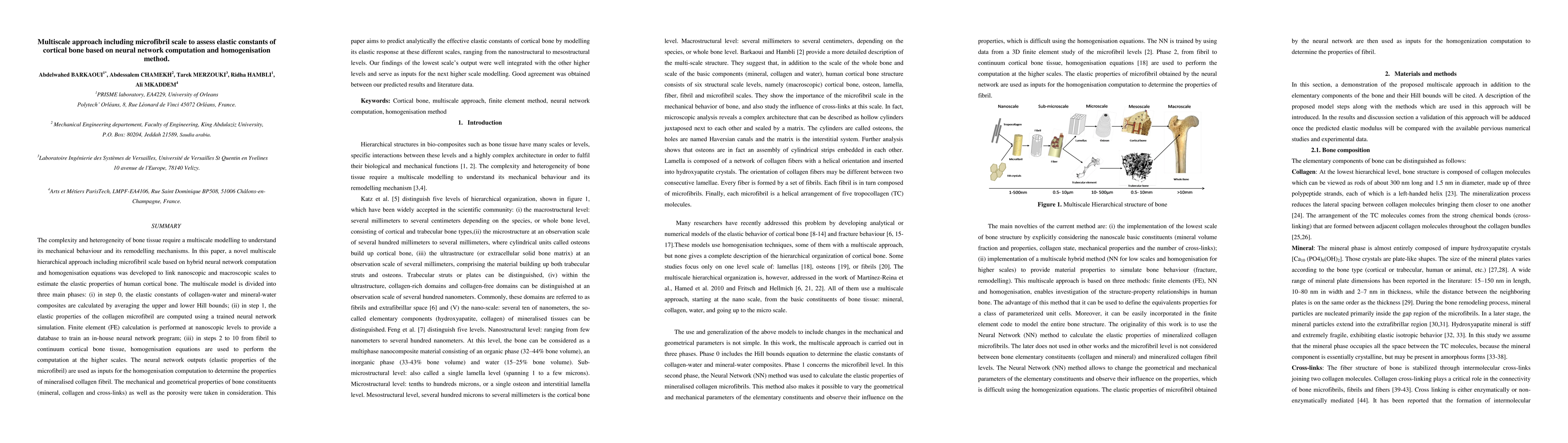 This paper develops a multiscale hierarchical approach combining neural network computation and homogenization methods to estimate the elastic properties of human cortical bone, integrating microfibril scale analysis and linking nanoscopic to macroscopic scales. The model shows good agreement with literature data, demonstrating effective prediction of cortical bone's elastic constants.