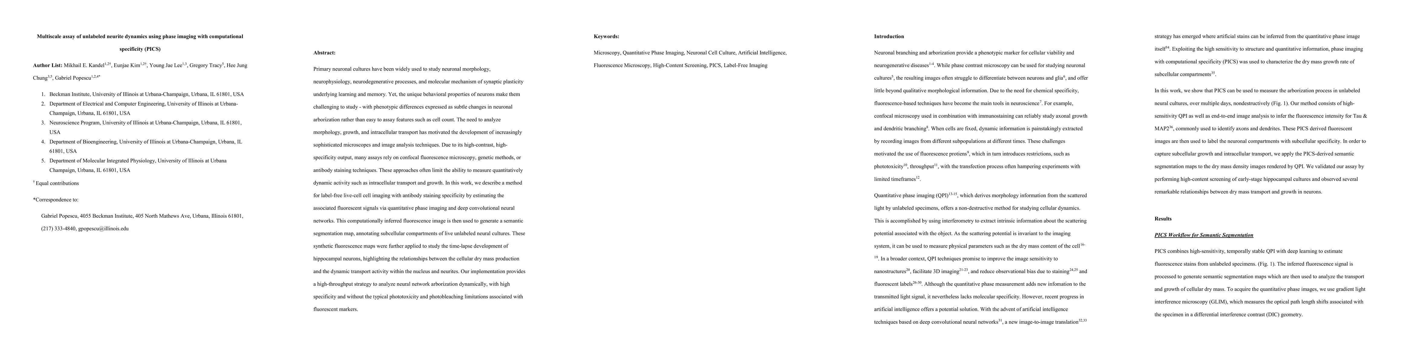 Primary neuronal cultures have been widely used to study neuronal morphology, neurophysiology, neurodegenerative processes, and molecular mechanism of synaptic plasticity underlying learning and memory. Yet, the unique behavioral properties of neurons make them challenging to study - with phenotypic differences expressed as subtle changes in neuronal arborization rather than easy to assay features such as cell count. The need to analyze morphology, growth, and intracellular transport has motivated the development of increasingly sophisticated microscopes and image analysis techniques. Due to its high-contrast, high-specificity output, many assays rely on confocal fluorescence microscopy, genetic methods, or antibody staining techniques. These approaches often limit the ability to measure quantitatively dynamic activity such as intracellular transport and growth. In this work, we describe a method for label-free live-cell cell imaging with antibody staining specificity by estimating the associated fluorescent signals via quantitative phase imaging and deep convolutional neural networks. This computationally inferred fluorescence image is then used to generate a semantic segmentation map, annotating subcellular compartments of live unlabeled neural cultures. These synthetic fluorescence maps were further applied to study the time-lapse development of hippocampal neurons, highlighting the relationships between the cellular dry mass production and the dynamic transport activity within the nucleus and neurites. Our implementation provides a high-throughput strategy to analyze neural network arborization dynamically, with high specificity and without the typical phototoxicity and photobleaching limitations associated with fluorescent markers.