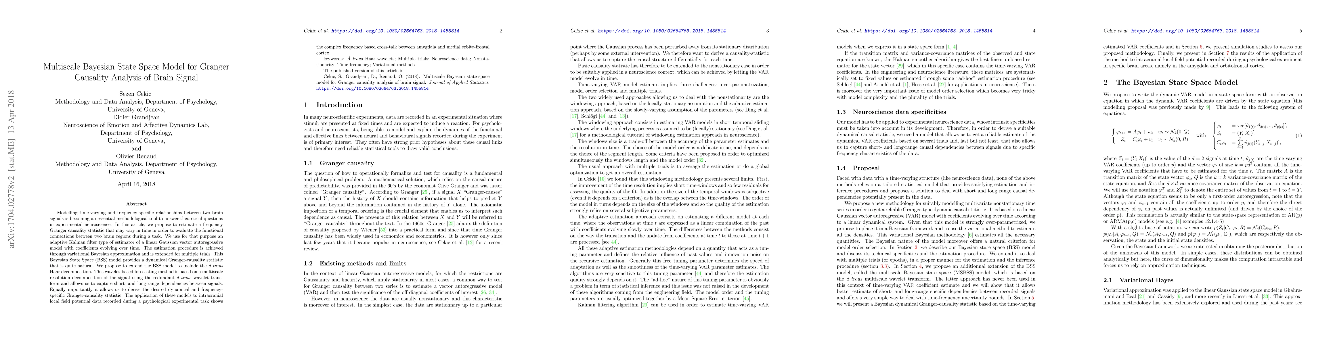 Modelling time-varying and frequency-specific relationships between two brain signals is becoming an essential methodological tool to answer heoretical questions in experimental neuroscience. In this article, we propose to estimate a frequency Granger causality statistic that may vary in time in order to evaluate the functional connections between two brain regions during a task. We use for that purpose an adaptive Kalman filter type of estimator of a linear Gaussian vector autoregressive model with coefficients evolving over time. The estimation procedure is achieved through variational Bayesian approximation and is extended for multiple trials. This Bayesian State Space (BSS) model provides a dynamical Granger-causality statistic that is quite natural. We propose to extend the BSS model to include the \`{a} trous Haar decomposition. This wavelet-based forecasting method is based on a multiscale resolution decomposition of the signal using the redundant \`{a} trous wavelet transform and allows us to capture short- and long-range dependencies between signals. Equally importantly it allows us to derive the desired dynamical and frequency-specific Granger-causality statistic. The application of these models to intracranial local field potential data recorded during a psychological experimental task shows the complex frequency based cross-talk between amygdala and medial orbito-frontal cortex. Keywords: \`{a} trous Haar wavelets; Multiple trials; Neuroscience data; Nonstationarity; Time-frequency; Variational methods The published version of this article is Cekic, S., Grandjean, D., Renaud, O. (2018). Multiscale Bayesian state-space model for Granger causality analysis of brain signal. Journal of Applied Statistics. https://doi.org/10.1080/02664763.2018.1455814