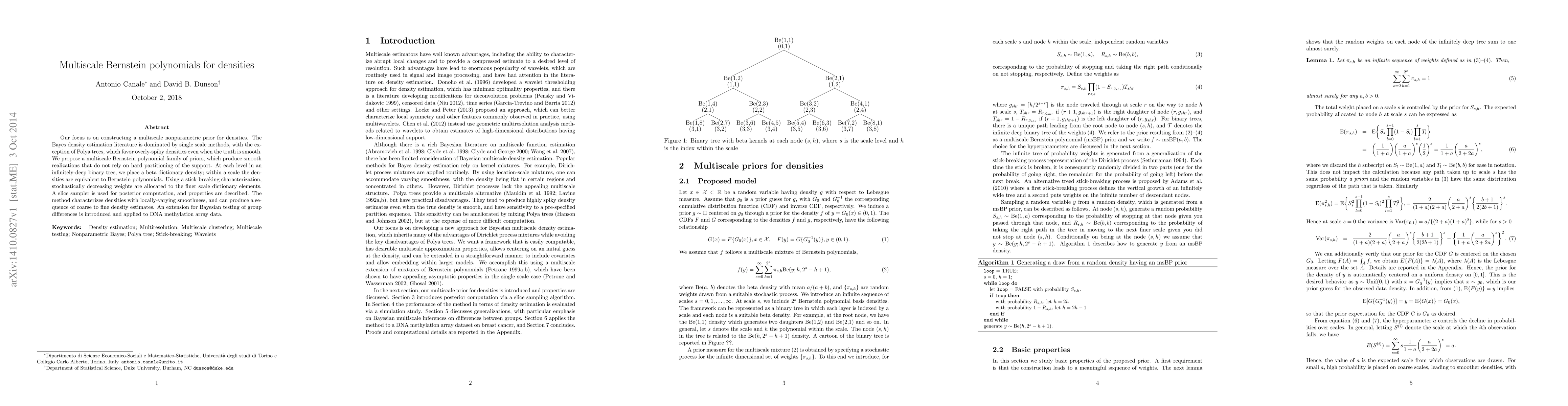 Our focus is on constructing a multiscale nonparametric prior for densities. The Bayes density estimation literature is dominated by single scale methods, with the exception of Polya trees, which favor overly-spiky densities even when the truth is smooth. We propose a multiscale Bernstein polynomial family of priors, which produce smooth realizations that do not rely on hard partitioning of the support. At each level in an infinitely-deep binary tree, we place a beta dictionary density; within a scale the densities are equivalent to Bernstein polynomials. Using a stick-breaking characterization, stochastically decreasing weights are allocated to the finer scale dictionary elements. A slice sampler is used for posterior computation, and properties are described. The method characterizes densities with locally-varying smoothness, and can produce a sequence of coarse to fine density estimates. An extension for Bayesian testing of group differences is introduced and applied to DNA methylation array data.