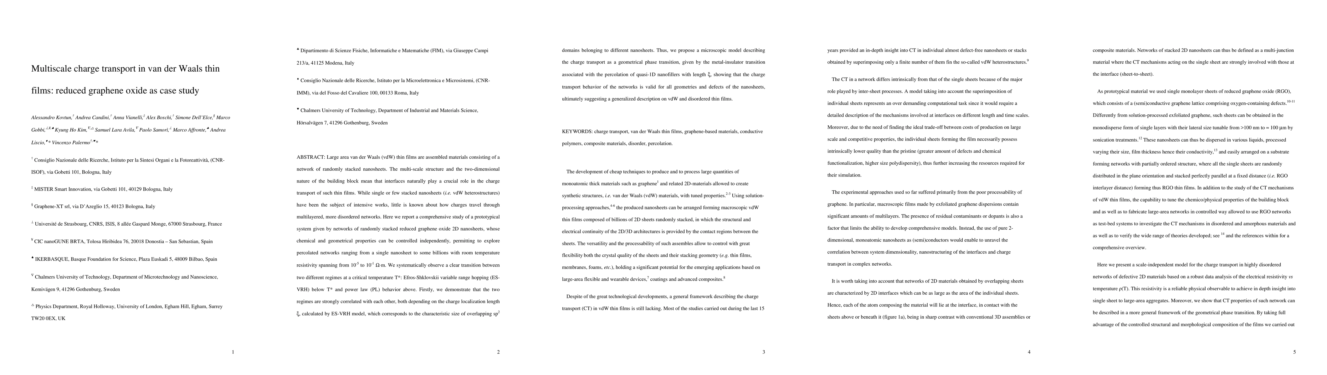 Researchers studied charge transport in van der Waals thin films made of reduced graphene oxide nanosheets, finding a transition between variable range hopping and power law behavior at a critical temperature, which they attribute to the percolation of quasi-1D nanofillers.