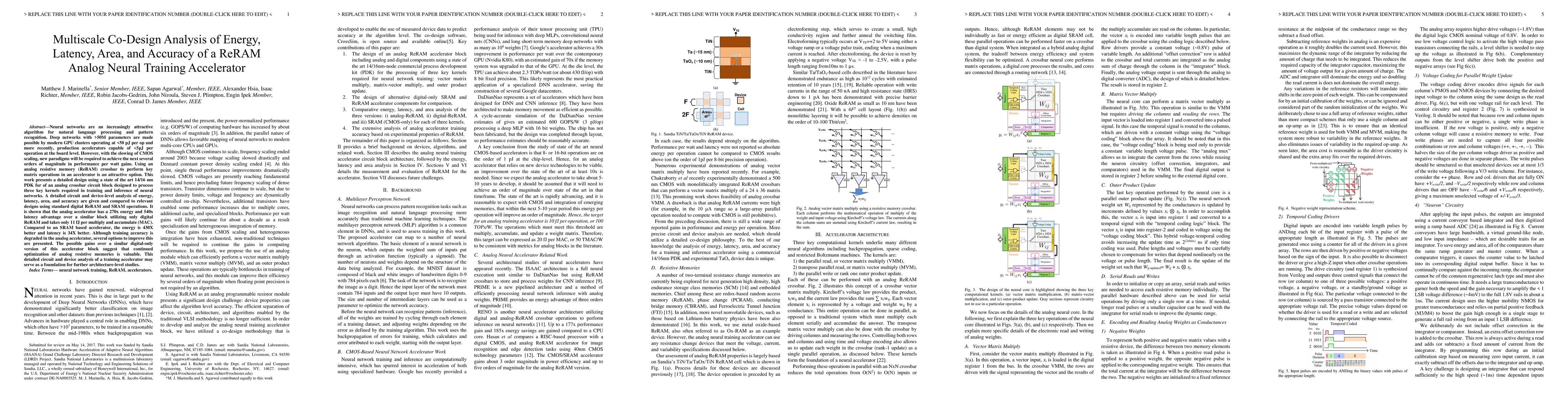 This paper presents a multiscale co-design analysis of an analog neural training accelerator using ReRAM crossbar circuits, demonstrating significant energy and latency improvements over digital alternatives, while also discussing methods to mitigate accuracy degradation. The analog design achieves 270x lower energy and 540x lower latency compared to a digital ReRAM-based accelerator.