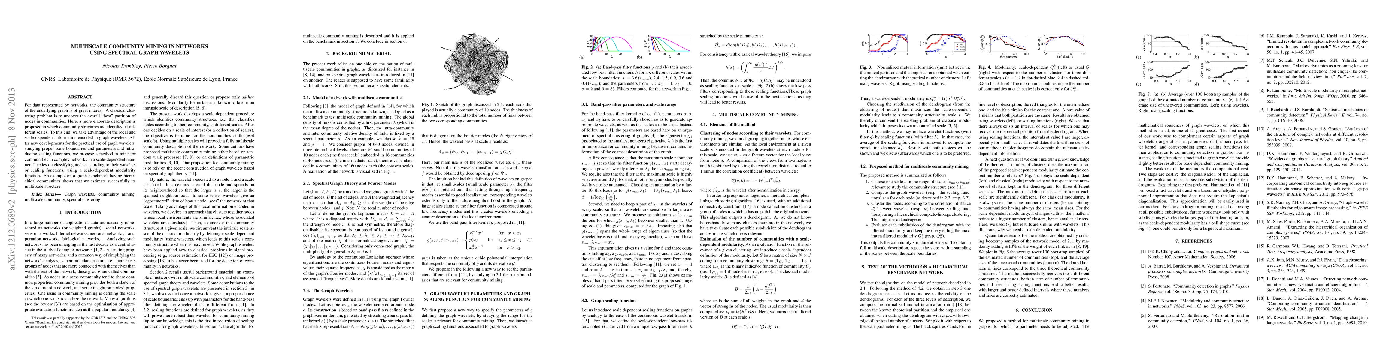 This paper proposes a method for identifying community structures at different scales in complex networks using spectral graph wavelets, classifying nodes based on their wavelets and scaling functions, and demonstrating its effectiveness on a benchmark graph with hierarchical communities.