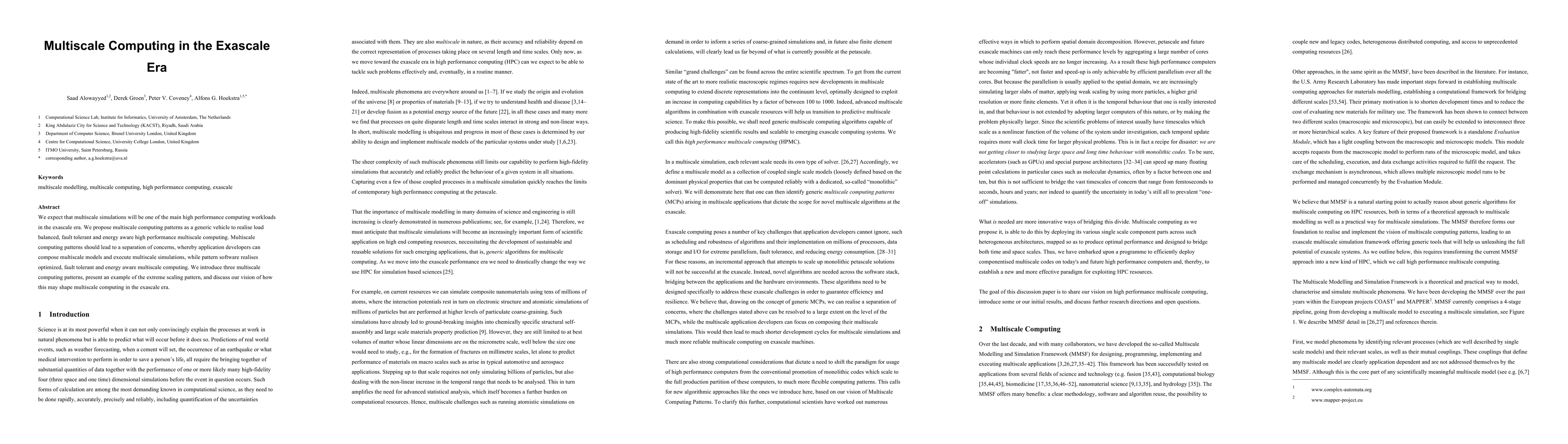 This paper proposes multiscale computing patterns to enable efficient, balanced, and fault-tolerant high-performance simulations for the exascale era. It introduces three patterns to separate application development from optimized execution, showcasing the extreme scaling pattern and envisioning their role in future multiscale computing.