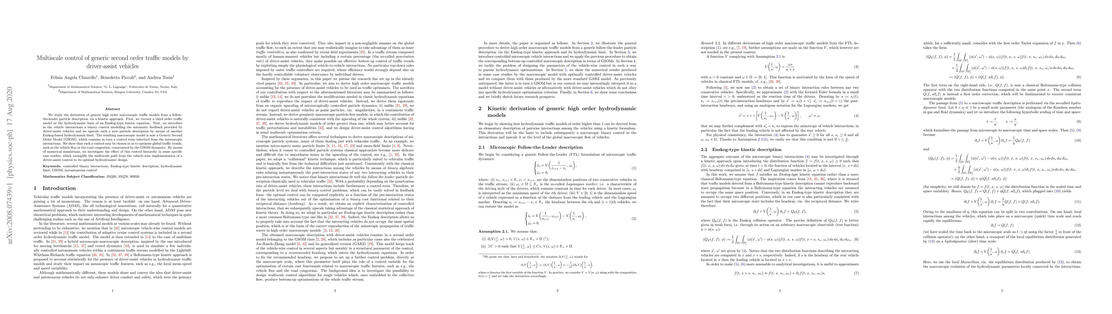 We study the derivation of generic high order macroscopic traffic models from a follow-the-leader particle description via a kinetic approach. First, we recover a third order traffic model as the hydrodynamic limit of an Enskog-type kinetic equation. Next, we introduce in the vehicle interactions a binary control modelling the automatic feedback provided by driver-assist vehicles and we upscale such a new particle description by means of another Enskog-based hydrodynamic limit. The resulting macroscopic model is now a Generic Second Order Model (GSOM), which contains in turn a control term inherited from the microscopic interactions. We show that such a control may be chosen so as to optimise global traffic trends, such as the vehicle flux or the road congestion, constrained by the GSOM dynamics. By means of numerical simulations, we investigate the effect of this control hierarchy in some specific case studies, which exemplify the multiscale path from the vehicle-wise implementation of a driver-assist control to its optimal hydrodynamic design.