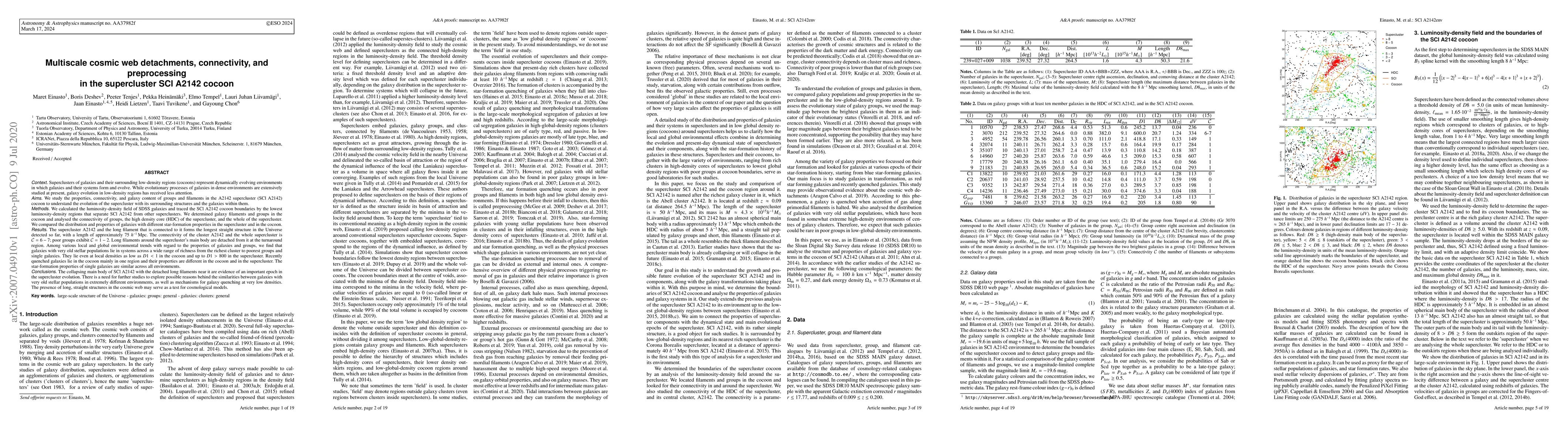We study the properties, connectivity, and galaxy content of groups and filaments in the low-density region (cocoon) around A2142 supercluster (SClA2142). We traced the SClA2142 cocoon boundaries by the lowest luminosity-density regions that separate SClA2142 from other superclusters. We determined galaxy filaments and groups in the cocoon and analysed the connectivity of groups, the high density core (HDC) of the supercluster, and the whole of the supercluster. We compared the distribution and properties of galaxies with different star-formation properties in the supercluster and in the cocoon. SClA2142 and the long filament that is connected to it forms the longest straight structure in the Universe detected so far, with a length of $75$ $h^{-1}$ Mpc. The connectivity of the supercluster is C = 6 - 7; poor groups have C = 1 - 2. Long filaments around the supercluster's main body are detached from it at the turnaround region. Galaxies with very old stellar populations lie in systems across a wide range of richness from the richest cluster to poorest groups and single galaxies. They lie even at local densities as low as $D1 < 1$ in the cocoon and up to $D1 > 800$ in the supercluster. Recently quenched galaxies lie in the cocoon mainly in one region and their properties are different in the cocoon and in the supercluster. The star-formation properties of single galaxies are similar across all environments. The collapsing main body of SClA2142 with the detached long filaments near it are evidence of an important epoch in the supercluster evolution. Further studies are needed to understand the reasons of similarity of galaxies with very old stellar populations in extremely different environments. The presence of long, straight structures in the cosmic web may serve as a test for cosmological models.