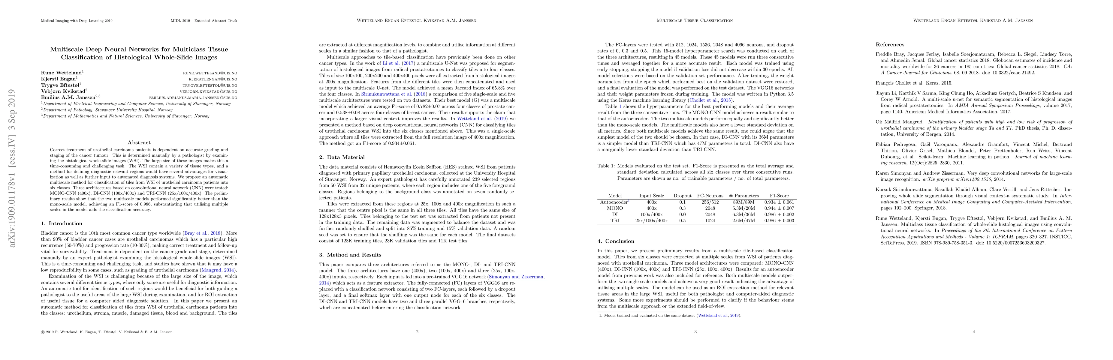 This paper proposes multiscale deep neural networks for classifying tissue types in histological whole-slide images of urothelial carcinoma, using three CNN architectures. The multiscale models significantly outperformed the mono-scale model, achieving an F1-score of 0.986, demonstrating improved classification accuracy.