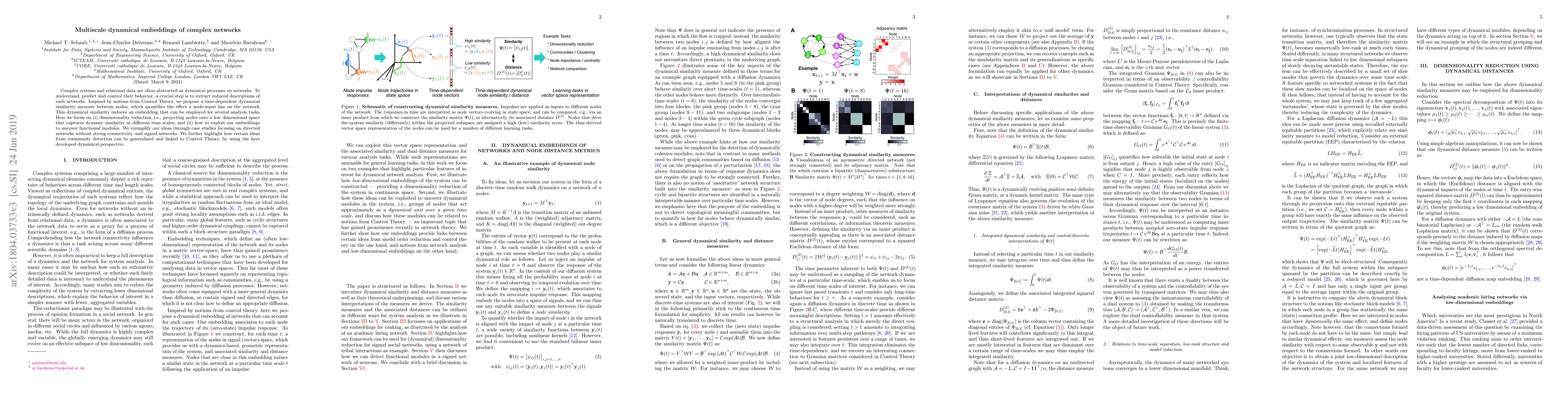 Complex systems and relational data are often abstracted as dynamical processes on networks. To understand, predict and control their behavior, a crucial step is to extract reduced descriptions of such networks. Inspired by notions from Control Theory, we propose a time-dependent dynamical similarity measure between nodes, which quantifies the effect a node-input has on the network. This dynamical similarity induces an embedding that can be employed for several analysis tasks. Here we focus on (i)~dimensionality reduction, i.e., projecting nodes onto a low dimensional space that captures dynamic similarity at different time scales, and (ii)~how to exploit our embeddings to uncover functional modules. We exemplify our ideas through case studies focusing on directed networks without strong connectivity, and signed networks. We further highlight how certain ideas from community detection can be generalized and linked to Control Theory, by using the here developed dynamical perspective.