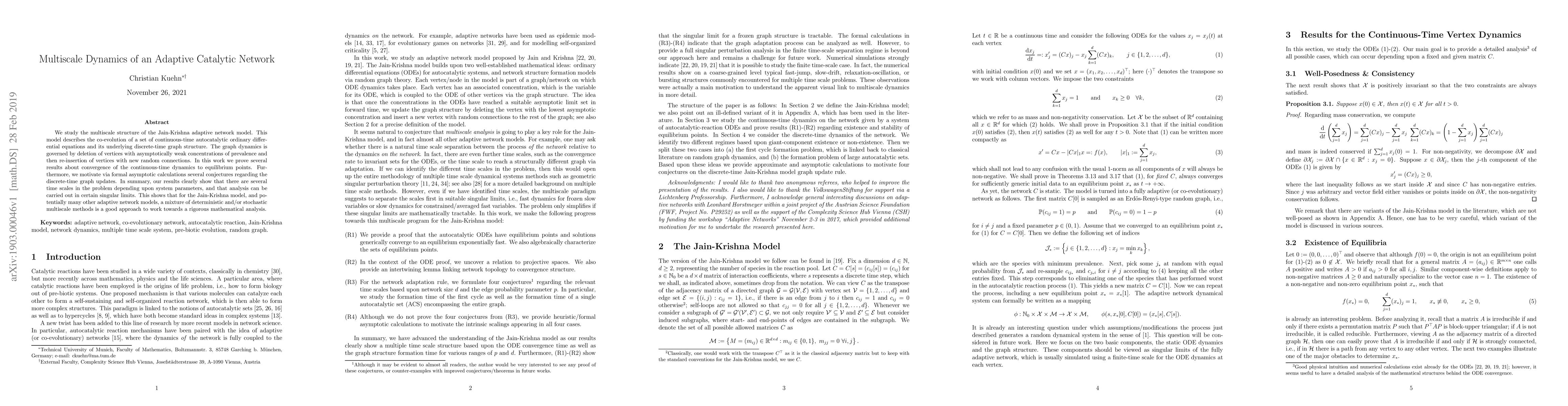 This paper investigates the multiscale dynamics of the Jain-Krishna adaptive network model, demonstrating convergence of continuous-time autocatalytic processes to equilibrium and proposing conjectures for discrete-time graph updates. The study highlights the necessity of multiscale methods for rigorous mathematical analysis of adaptive networks.