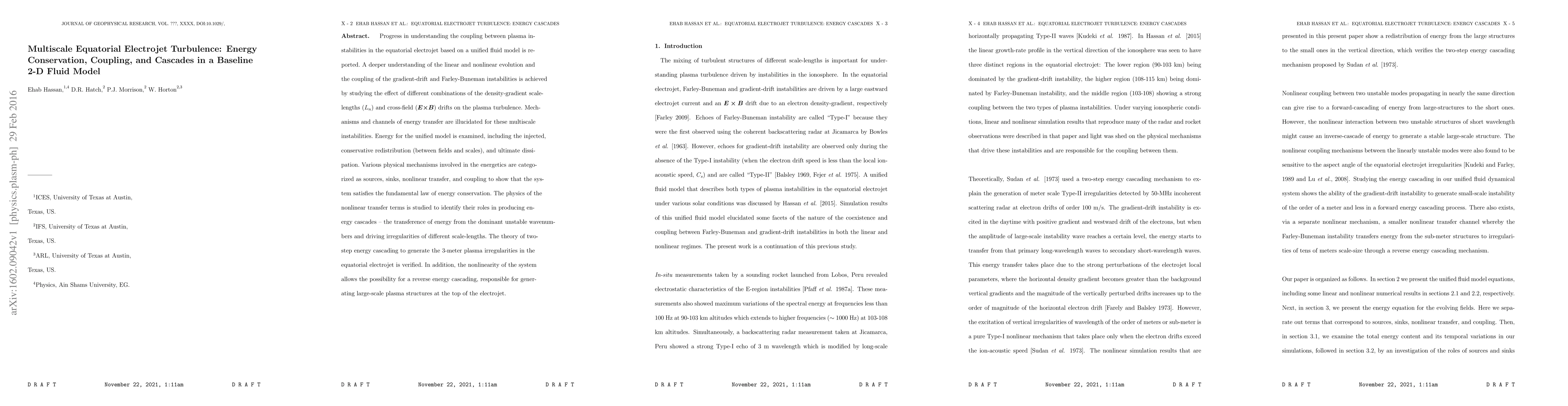 Researchers studied plasma turbulence in the equatorial electrojet using a unified fluid model, revealing mechanisms for energy transfer and conservation, including nonlinear cascading and reverse energy flow.