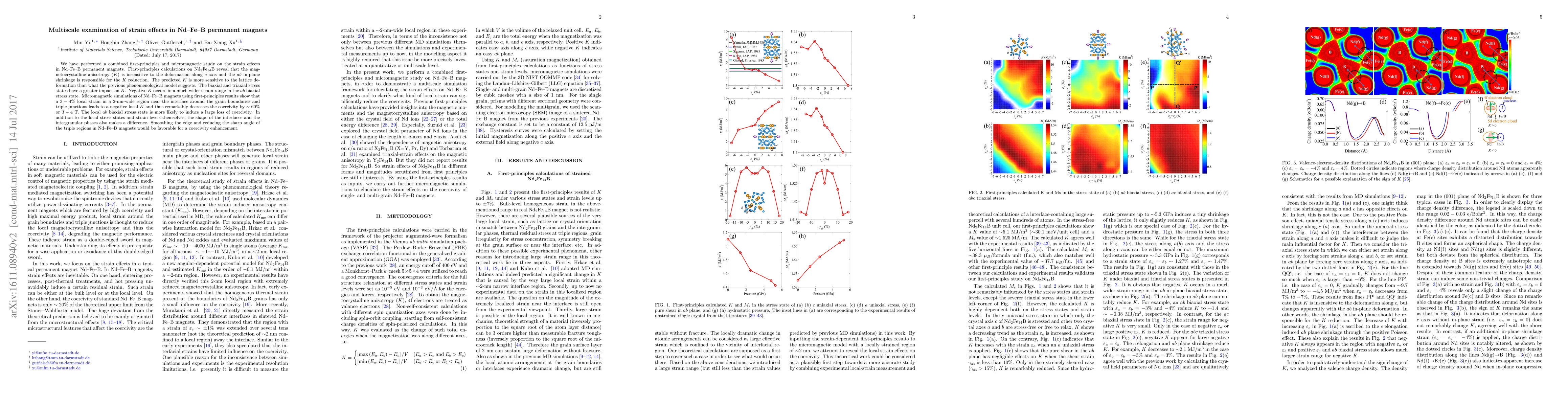 This study combines first-principles and micromagnetic analyses to investigate strain effects on Nd-Fe-B magnets, finding that lattice deformation significantly reduces magnetocrystalline anisotropy, especially under biaxial stress. Micromagnetic simulations reveal that local strains near grain boundaries can decrease coercivity by ~60%, highlighting the importance of interface geometry for coercivity enhancement.