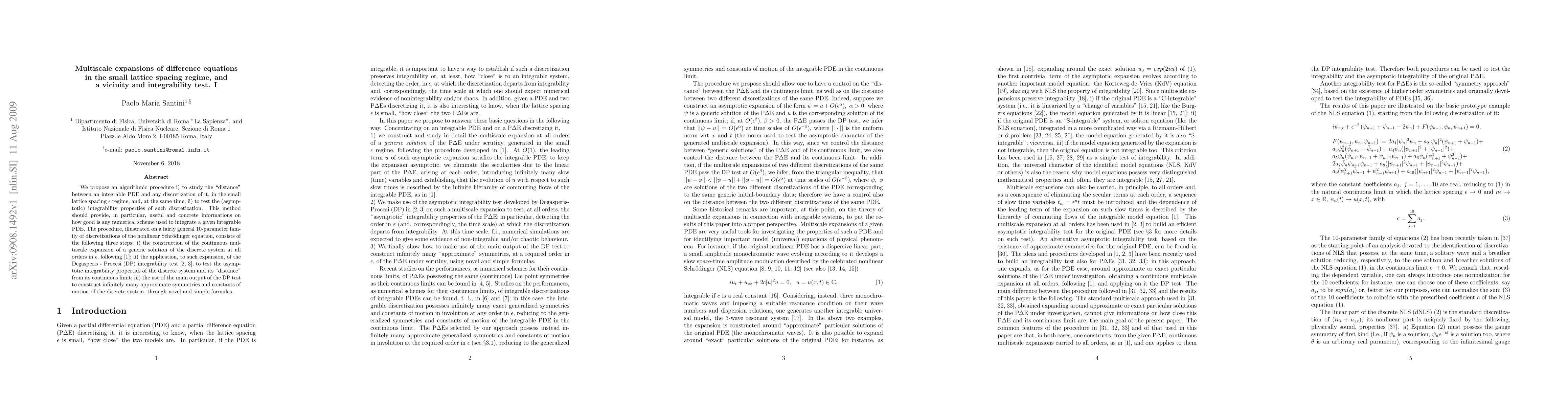 We propose an algorithmic procedure i) to study the ``distance'' between an integrable PDE and any discretization of it, in the small lattice spacing epsilon regime, and, at the same time, ii) to test the (asymptotic) integrability properties of such discretization. This method should provide, in particular, useful and concrete informations on how good is any numerical scheme used to integrate a given integrable PDE. The procedure, illustrated on a fairly general 10-parameter family of discretizations of the nonlinear Schroedinger equation, consists of the following three steps: i) the construction of the continuous multiscale expansion of a generic solution of the discrete system at all orders in epsilon, following the Degasperis - Manakov - Santini procedure; ii) the application, to such expansion, of the Degasperis - Procesi (DP) integrability test, to test the asymptotic integrability properties of the discrete system and its ``distance'' from its continuous limit; iii) the use of the main output of the DP test to construct infinitely many approximate symmetries and constants of motion of the discrete system, through novel and simple formulas.