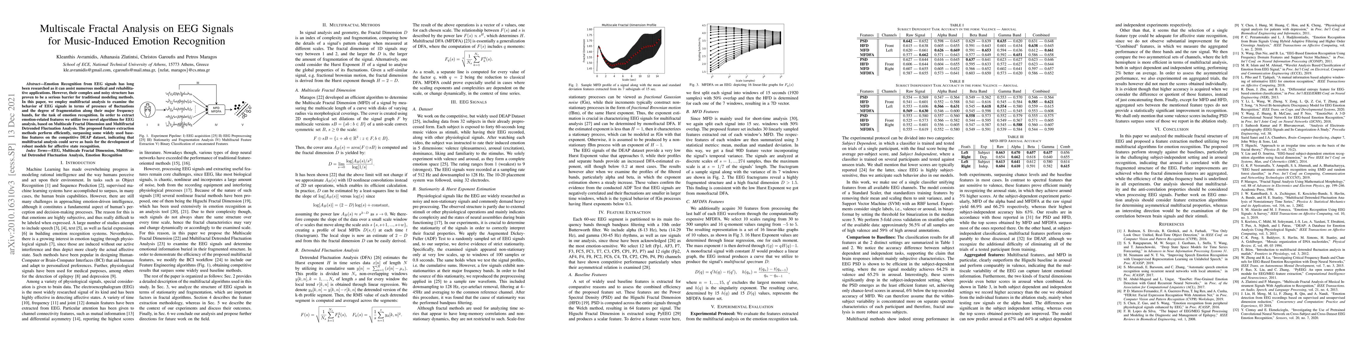 Emotion Recognition from EEG signals has long been researched as it can assist numerous medical and rehabilitative applications. However, their complex and noisy structure has proven to be a serious barrier for traditional modeling methods. In this paper, we employ multifractal analysis to examine the behavior of EEG signals in terms of presence of fluctuations and the degree of fragmentation along their major frequency bands, for the task of emotion recognition. In order to extract emotion-related features we utilize two novel algorithms for EEG analysis, based on Multiscale Fractal Dimension and Multifractal Detrended Fluctuation Analysis. The proposed feature extraction methods perform efficiently, surpassing some widely used baseline features on the competitive DEAP dataset, indicating that multifractal analysis could serve as basis for the development of robust models for affective state recognition.