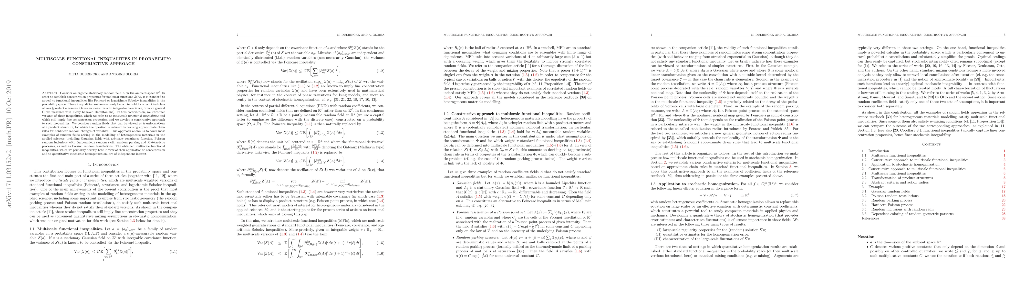 Consider an ergodic stationary random field $A$ on the ambient space $\mathbb R^d$. In order to establish concentration properties for nonlinear functions $Z(A)$, it is standard to appeal to functional inequalities like Poincar\'e or logarithmic Sobolev inequalities in the probability space. These inequalities are however only known to hold for a restricted class of laws (product measures, Gaussian measures with integrable covariance, or more general Gibbs measures with nicely behaved Hamiltonians). In this contribution, we introduce variants of these inequalities, which we refer to as multiscale functional inequalities and which still imply fine concentration properties, and we develop a constructive approach to such inequalities. We consider random fields that can be viewed as transformations of a product structure, for which the question is reduced to devising approximate chain rules for nonlinear random changes of variables. This approach allows us to cover most examples of random fields arising in the modelling of heterogeneous materials in the applied sciences, including Gaussian fields with arbitrary covariance function, Poisson random inclusions with (unbounded) random radii, random parking and Mat\'ern-type processes, as well as Poisson random tessellations. The obtained multiscale functional inequalities, which we primarily develop here in view of their application to concentration and to quantitative stochastic homogenization, are of independent interest.