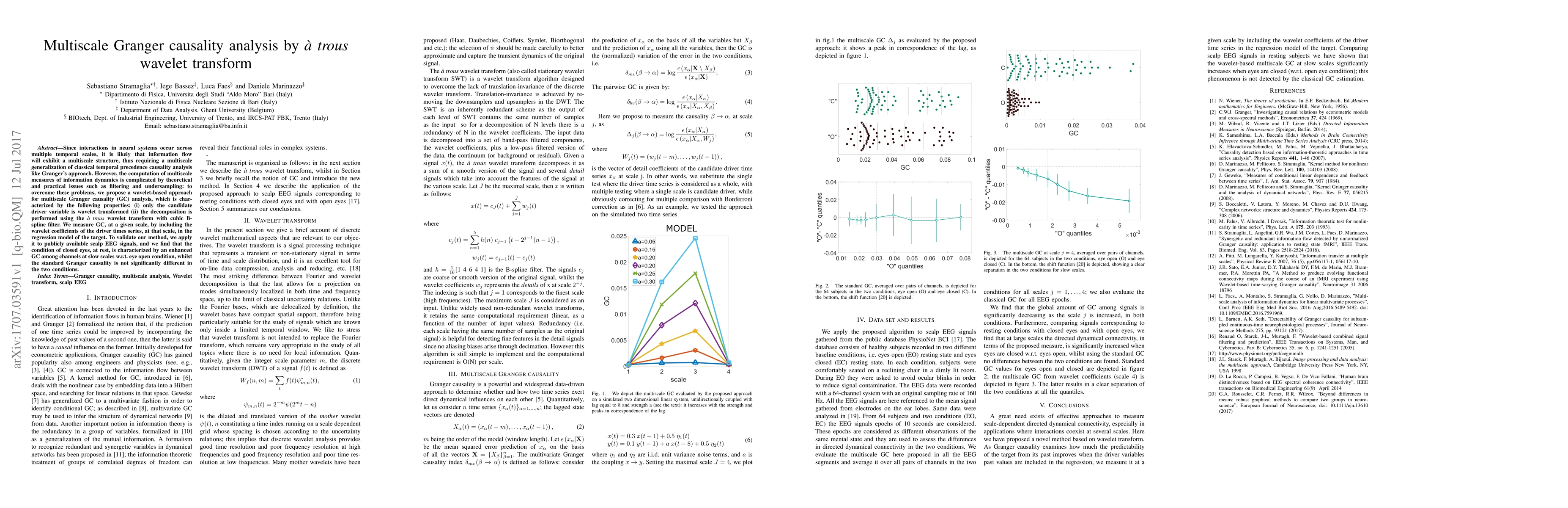 This paper proposes a wavelet-based method for multiscale Granger causality analysis using the \`a trous wavelet transform to address theoretical and practical issues in measuring information dynamics across multiple temporal scales. The method shows enhanced multiscale Granger causality among EEG channels during closed eyes at rest compared to the open eyes condition.