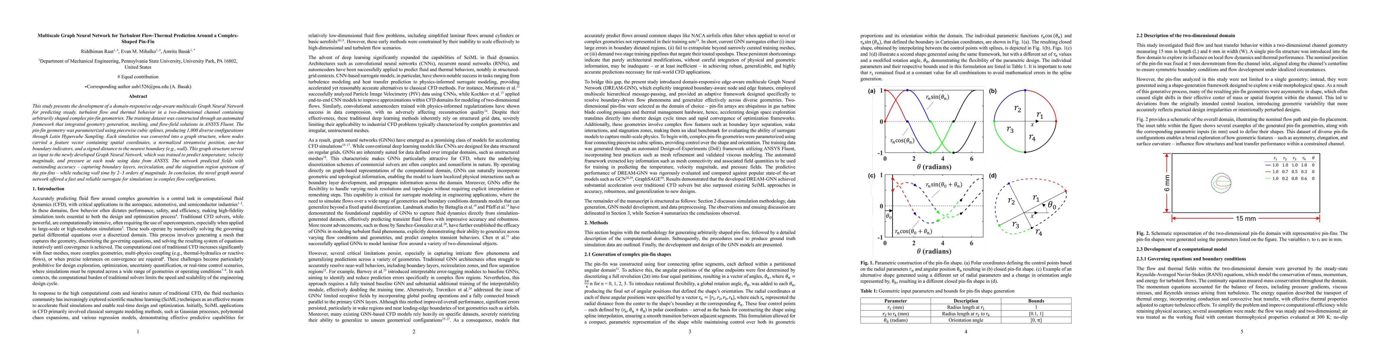 This study presents the development of a domain-responsive edge-aware multiscale Graph Neural Network for predicting steady, turbulent flow and thermal behavior in a two-dimensional channel containing arbitrarily shaped complex pin-fin geometries. The training dataset was constructed through an automated framework that integrated geometry generation, meshing, and flow-field solutions in ANSYS Fluent. The pin-fin geometry was parameterized using piecewise cubic splines, producing 1,000 diverse configurations through Latin Hypercube Sampling. Each simulation was converted into a graph structure, where nodes carried a feature vector containing spatial coordinates, a normalized streamwise position, one-hot boundary indicators, and a signed distance to the nearest boundary such as wall. This graph structure served as input to the newly developed Graph Neural Network, which was trained to predict temperature, velocity magnitude, and pressure at each node using data from ANSYS. The network predicted fields with outstanding accuracy, capturing boundary layers, recirculation, and the stagnation region upstream of the pin-fins while reducing wall time by 2-3 orders of magnitude. In conclusion, the novel graph neural network offered a fast and reliable surrogate for simulations in complex flow configurations.