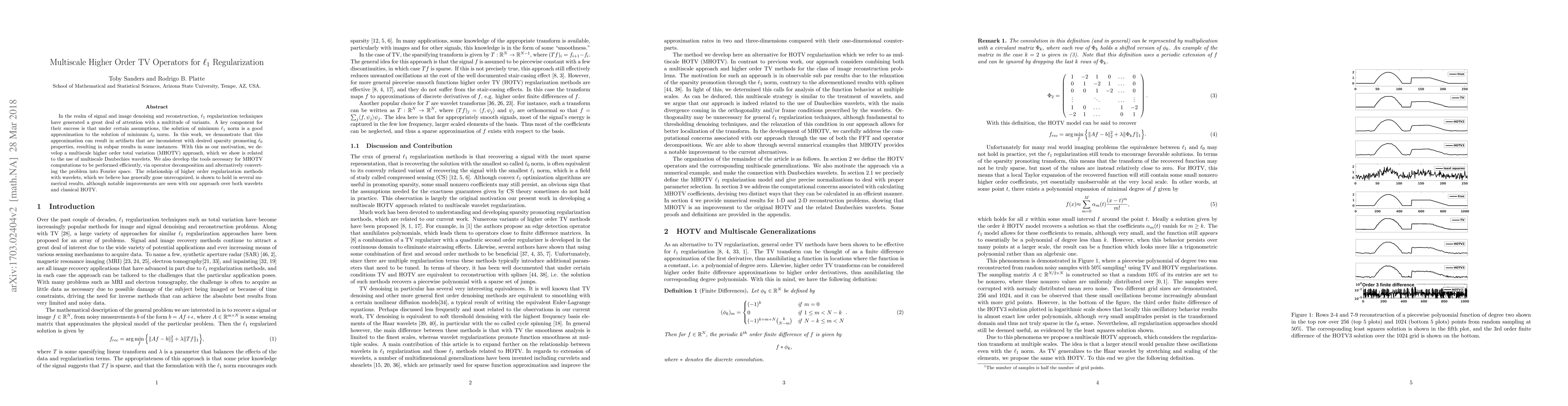 In the realm of signal and image denoising and reconstruction, $\ell_1$ regularization techniques have generated a great deal of attention with a multitude of variants. A key component for their success is that under certain assumptions, the solution of minimum $\ell_1$ norm is a good approximation to the solution of minimum $\ell_0$ norm. In this work, we demonstrate that this approximation can result in artifacts that are inconsistent with desired sparsity promoting $\ell_0$ properties, resulting in subpar results in {some} instances. With this as our motivation, we develop a multiscale higher order total variation (MHOTV) approach, which we show is related to the use of multiscale Daubechies wavelets. We also develop the tools necessary for MHOTV computations to be performed efficiently, via operator decomposition and alternatively converting the problem into Fourier space. The relationship of higher order regularization methods with wavelets, which we believe has generally gone unrecognized, is shown to hold in several numerical results, although notable improvements are seen with our approach over both wavelets and classical HOTV.