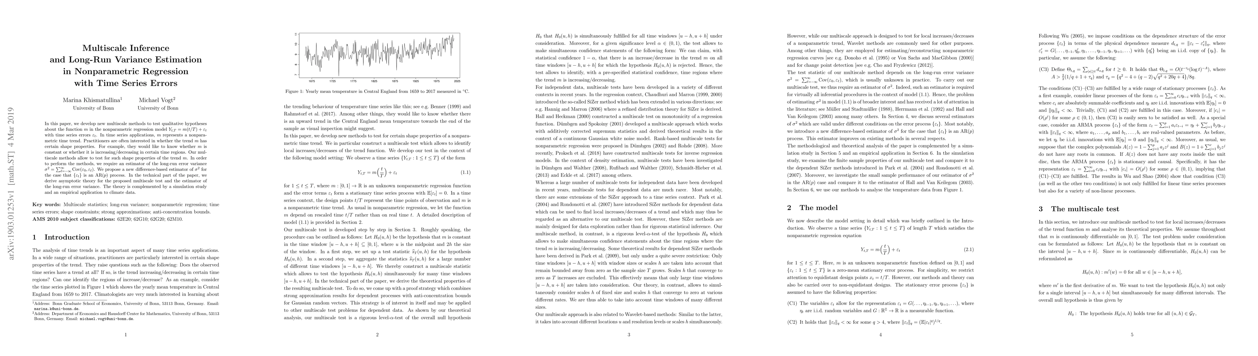 This paper introduces multiscale methods for testing shape properties of nonparametric regression functions with time series errors, proposing a new difference-based estimator for long-run variance in AR(p) processes. The methods are supported by asymptotic theory, simulations, and an empirical application to climate data.