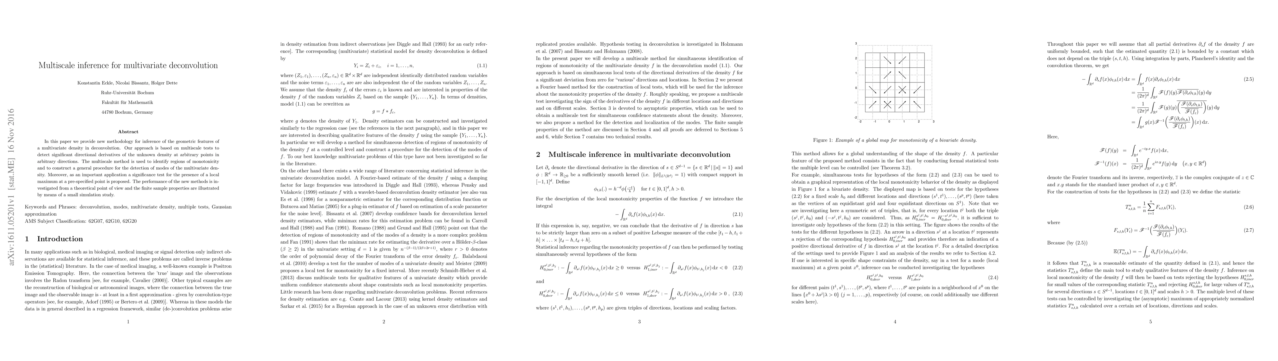 This paper introduces a novel multiscale method for detecting significant geometric features of multivariate densities in deconvolution. It identifies regions of monotonicity, constructs a procedure for mode detection, and proposes a test for local maxima presence at specified points. Theoretical performance and simulation studies support the methodology.