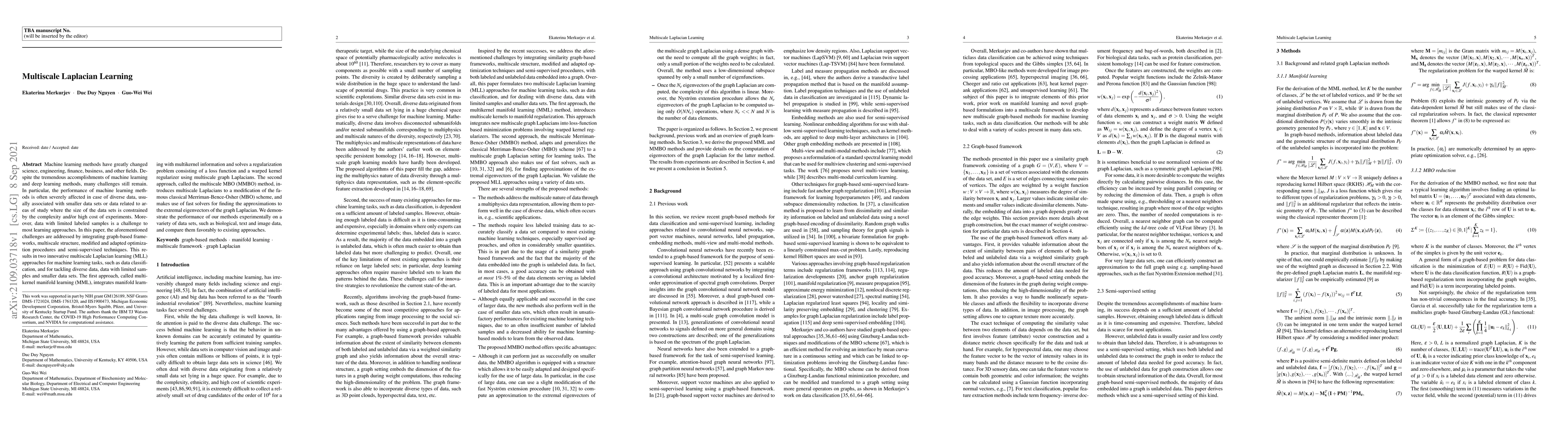 This paper proposes two innovative multiscale Laplacian learning (MLL) approaches—multikernel manifold learning (MML) and multiscale MBO (MMBO)—to address challenges in machine learning with diverse, limited-sample, and small data sets. Both methods leverage graph-based frameworks and semi-supervised techniques to improve performance on classification tasks.