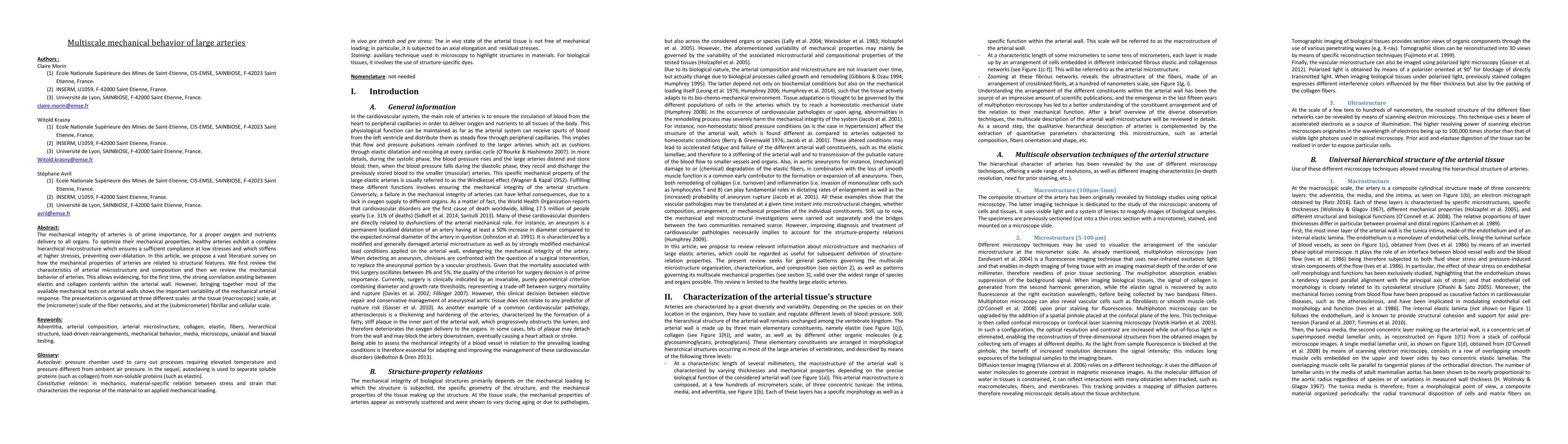 This paper reviews the multiscale mechanical behavior of large arteries, highlighting the correlation between elastin and collagen content in the arterial wall. It examines the mechanical properties at tissue, fiber network, and fibrillar/cellular scales, revealing significant variability in arterial response.